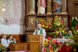 20 sierpnia, o godz. 14, odprawiona została uroczysta msza dziękczynna za tegoroczne zbiory. Wydawać by się mogło, że dożynki przeżywane w mieście to jakieś nieporozumienie. ale nic bardziej mylnego. Dziękować za trud pracy na roli oraz za to co ziemia urodziła byśmy nie byli głodni, dziękować winien każdy. Każdy bowiem z pracy rolnika korzysta i jej potrzebuje. Uroczystej mszy przewodniczył ks. dziekan Kazimierz Piwowar a współkoncelebrował ks. proboszcz Grzegorz Kowalczyk. Okolicznościową homilię wygłosił ks. Krzysztof Szyndler, który przypominając dawny i współczesny trud pracy na roli, wskazał na postawę, która winna nas wszystkich charakteryzować a chodzi o wdzięczność. Człowiek prawdziwie wierzący, ową wdzięczność winien okazać zawsze najpierw Bogu, sprawcy wszelkiego dobra ale nie można też zapomnieć o ludziach, którzy swoim trudem pracy przyczyniają się do naszego spokoju o tzw. powszedni chleb.