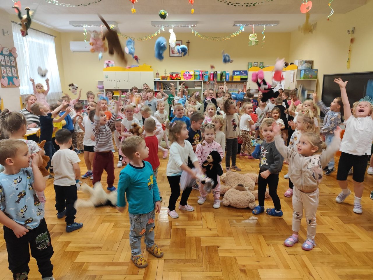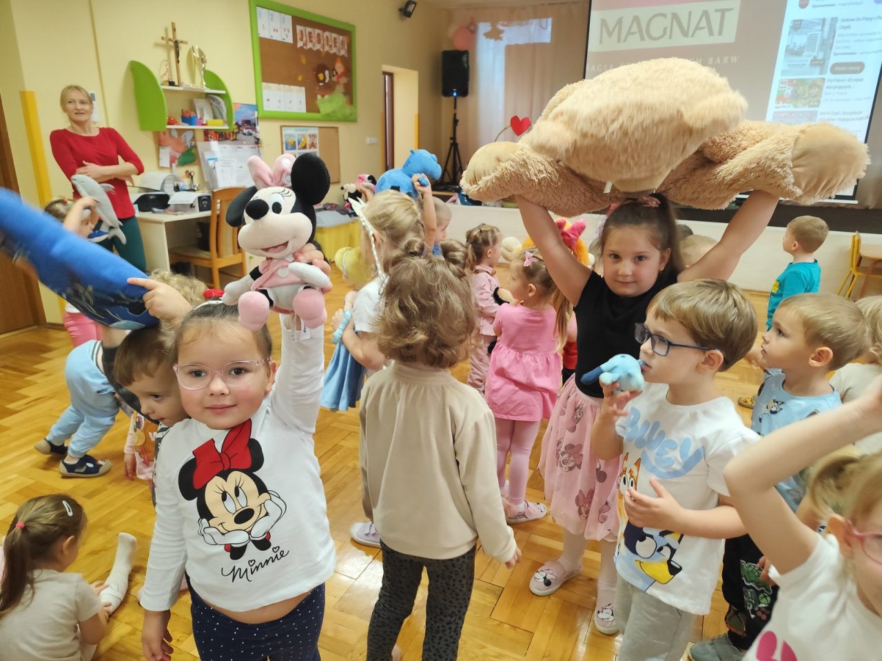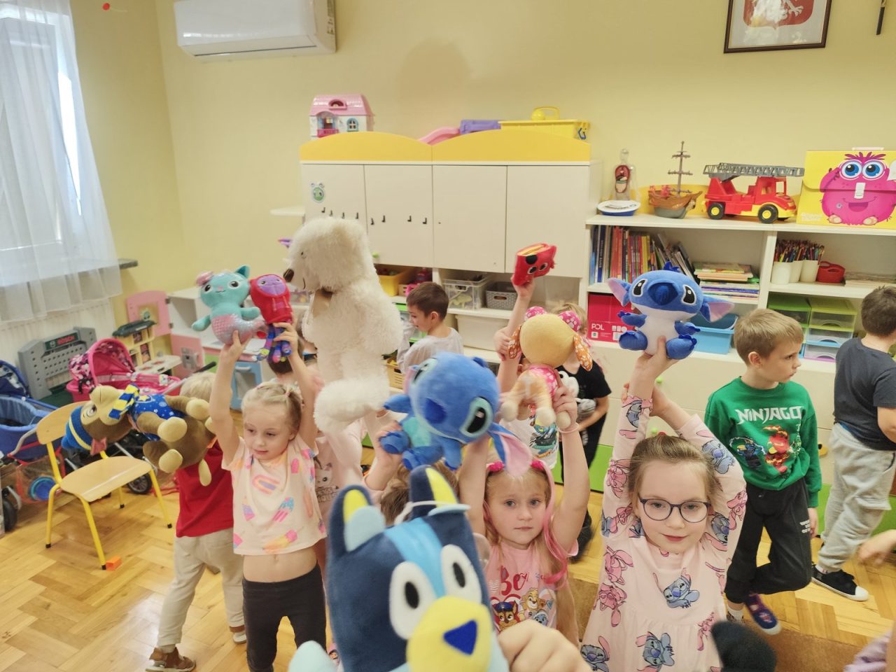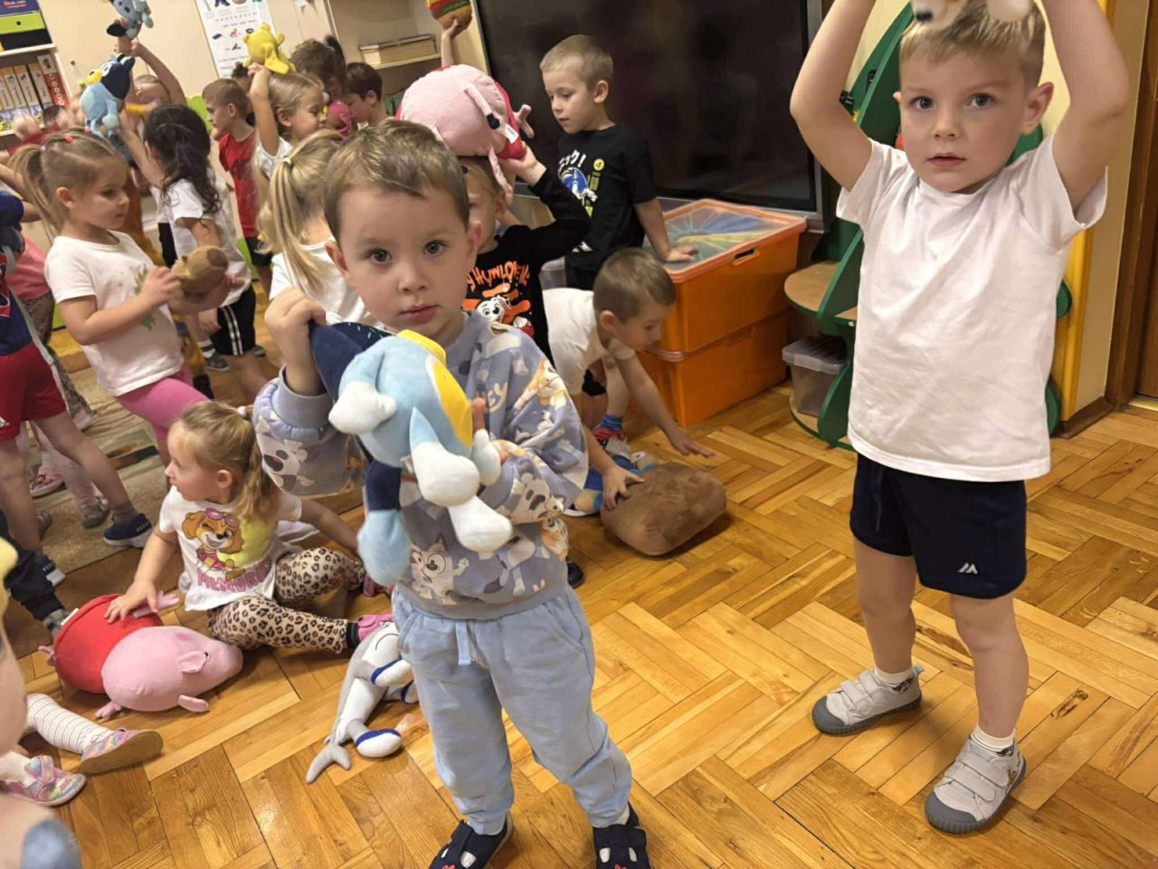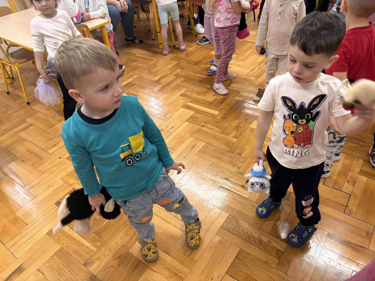 Na początku dnia dzieci uczestniczyły w prezentacji dotyczącej tematyki bajek, gdzie przypomnieliśmy sobie, dlaczego bajki są tak ważne i czego nas uczą. 📚 Następnie przedszkolaki z dumą prezentowały swoje przyniesione przytulanki przedstawiające ulubionych bohaterów. Każde dziecko miało okazję opowiedzieć o swojej postaci i bajce, z której pochodzi. 🧸✨