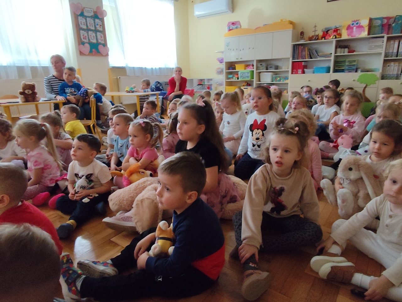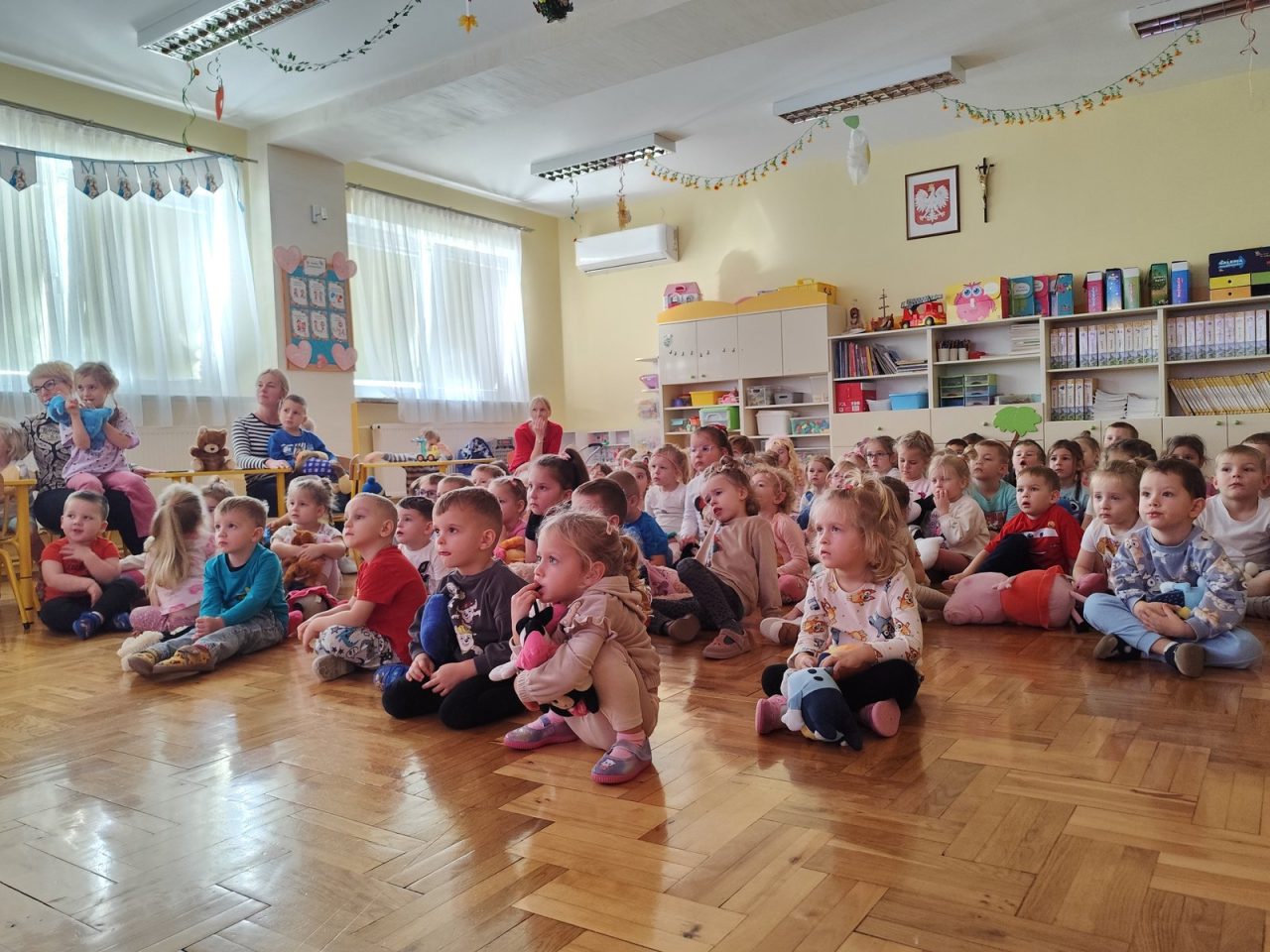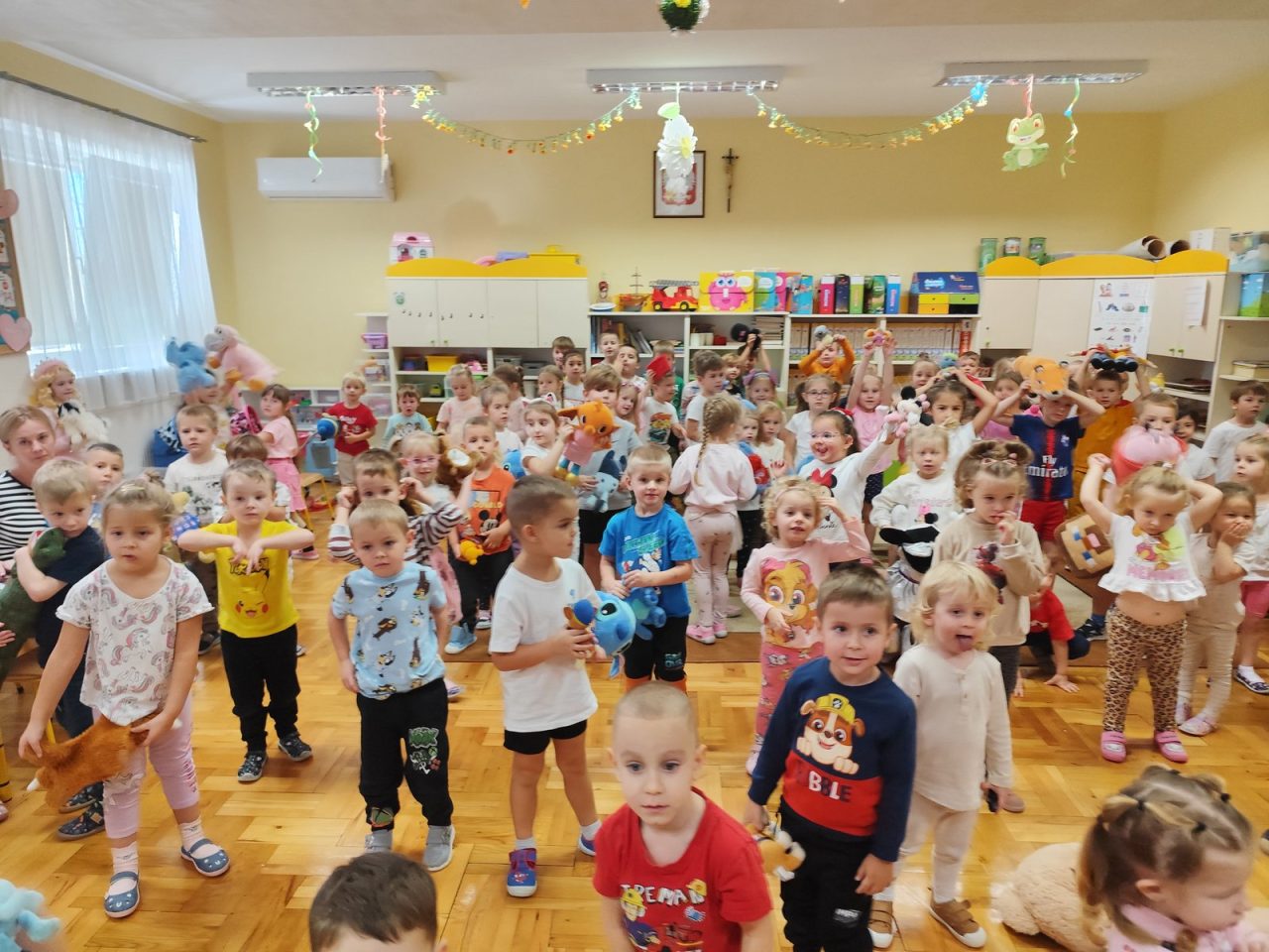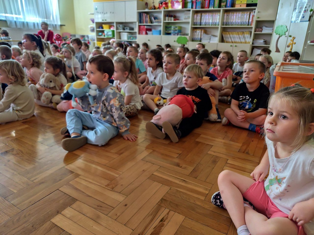 Na początku dnia dzieci uczestniczyły w prezentacji dotyczącej tematyki bajek, gdzie przypomnieliśmy sobie, dlaczego bajki są tak ważne i czego nas uczą. 📚 Następnie przedszkolaki z dumą prezentowały swoje przyniesione przytulanki przedstawiające ulubionych bohaterów. Każde dziecko miało okazję opowiedzieć o swojej postaci i bajce, z której pochodzi. 🧸✨