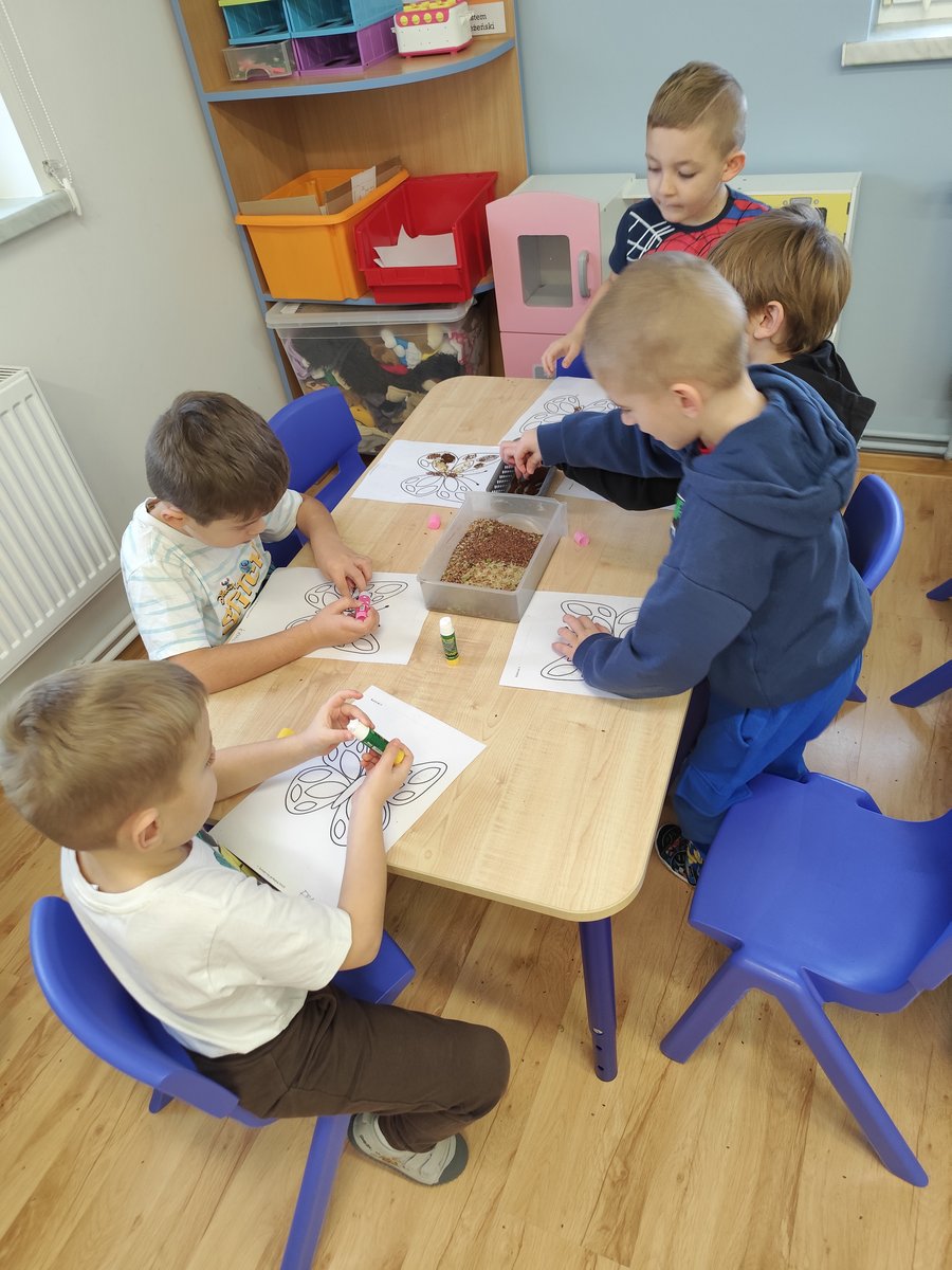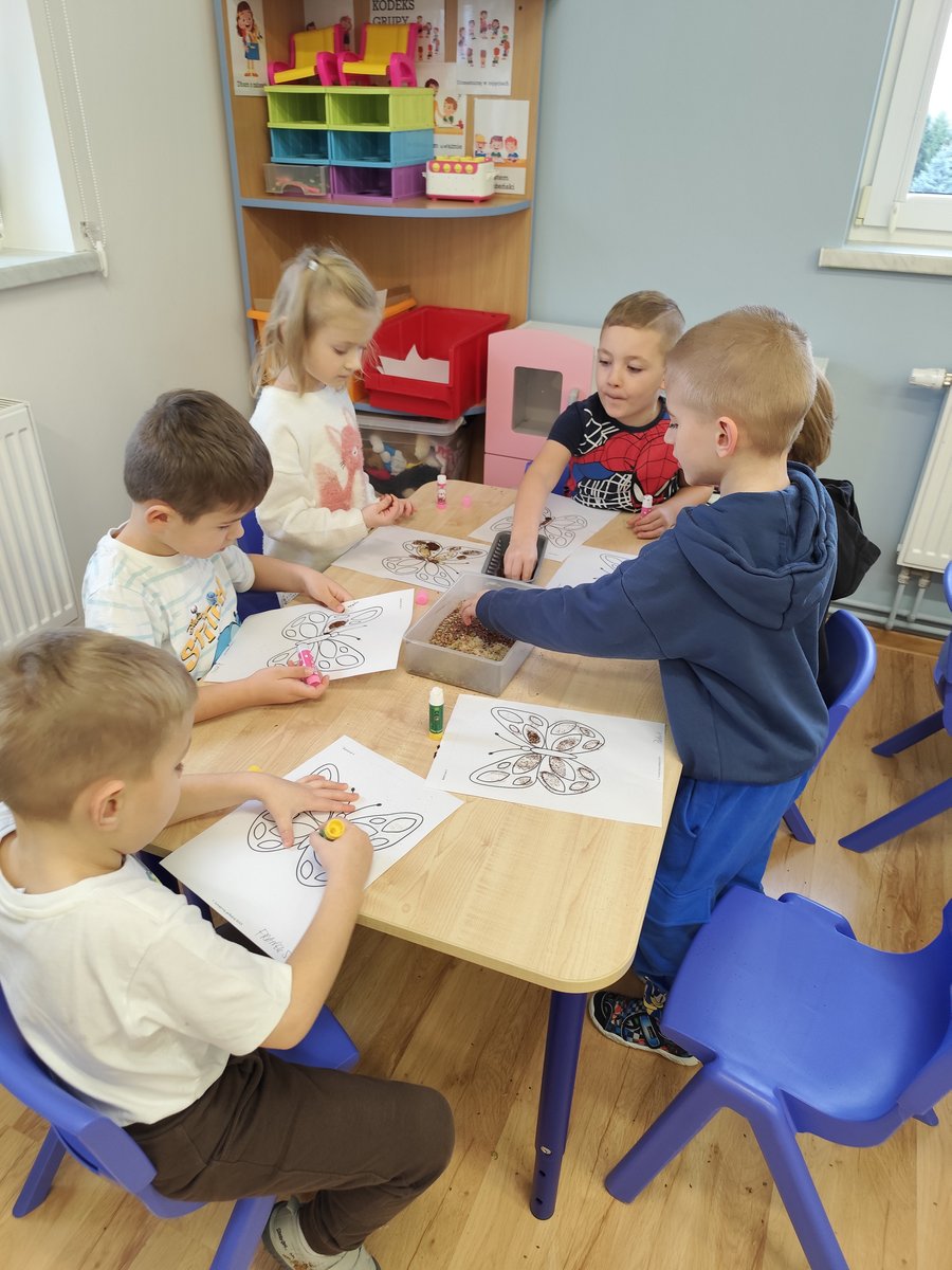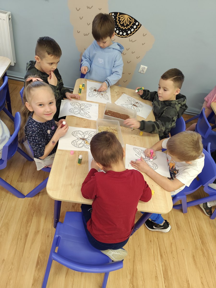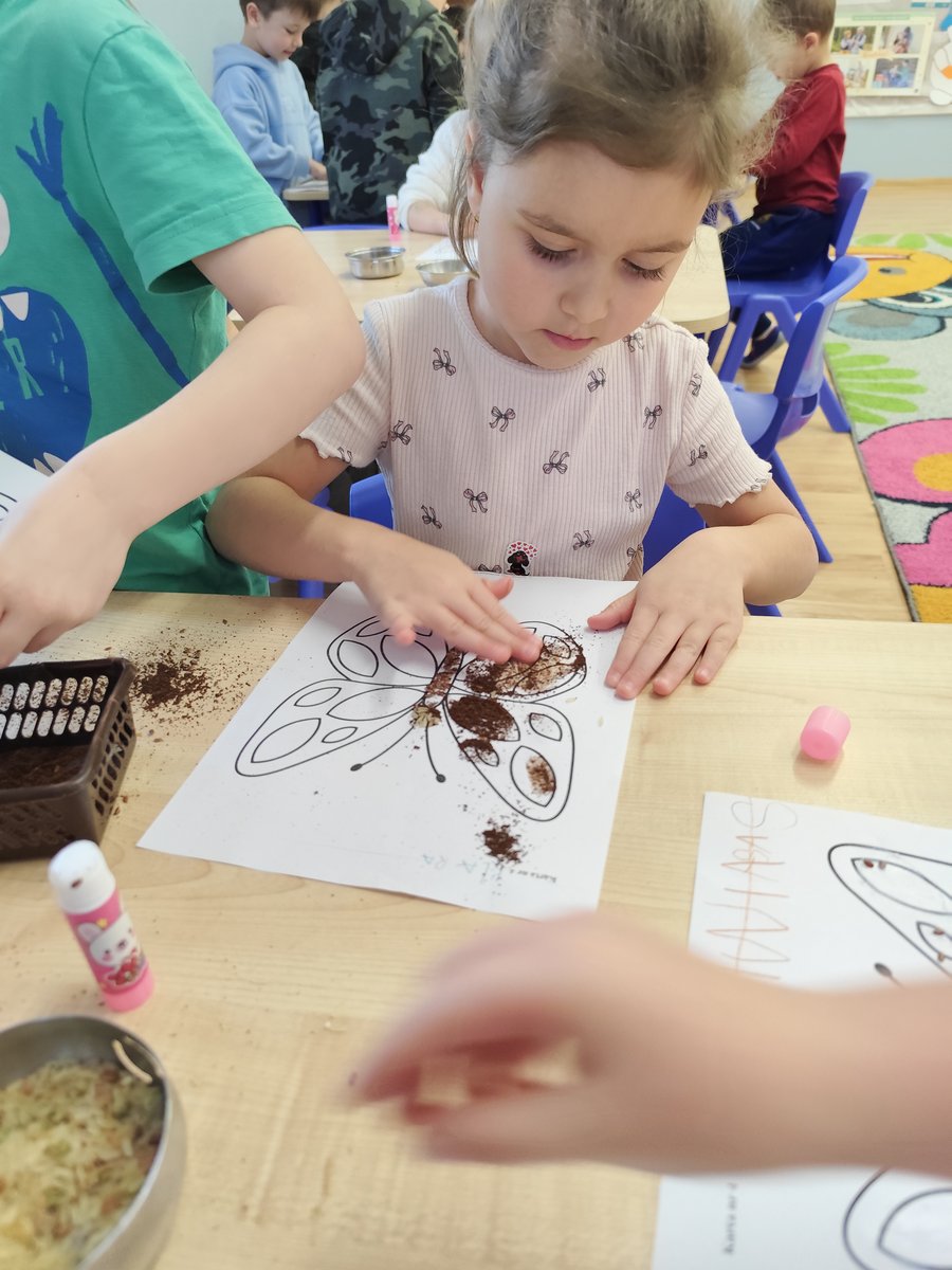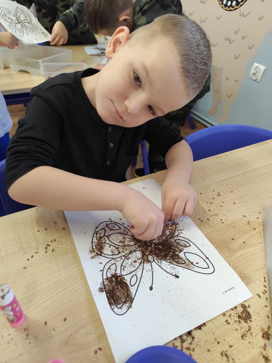 Dzieci starannie smarowały wybrane elementy wzoru klejem, a następnie – za pomocą rączek – wysypywały na nie sypkie materiały, tworząc barwne i fakturowe kompozycje. 🎉