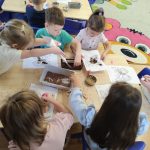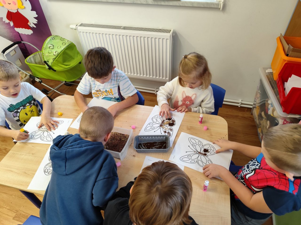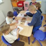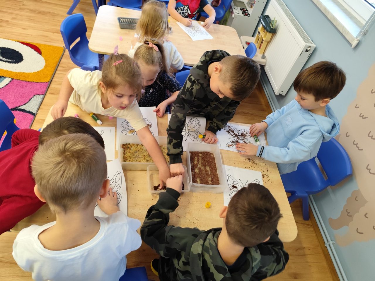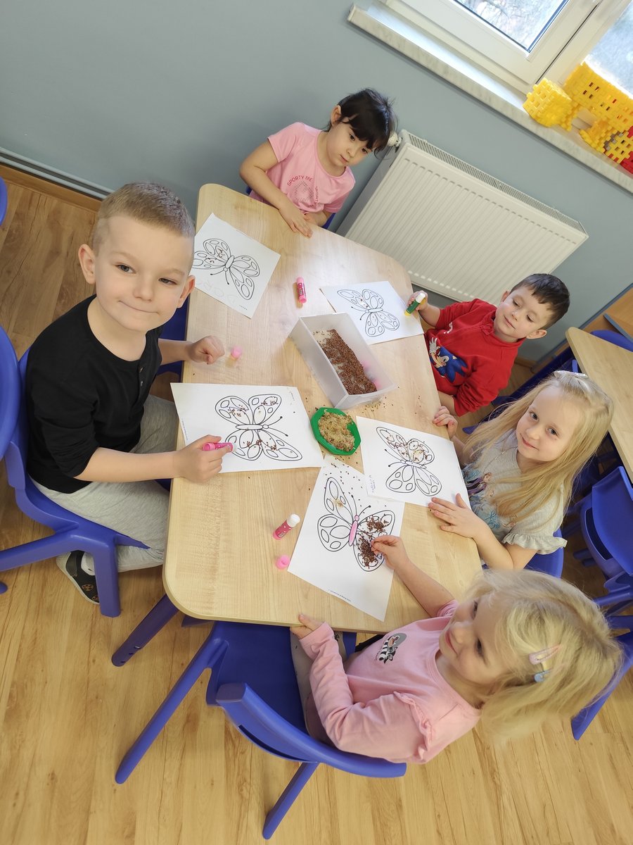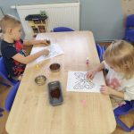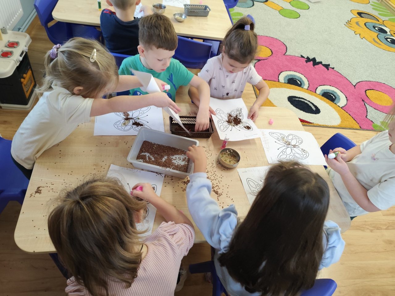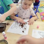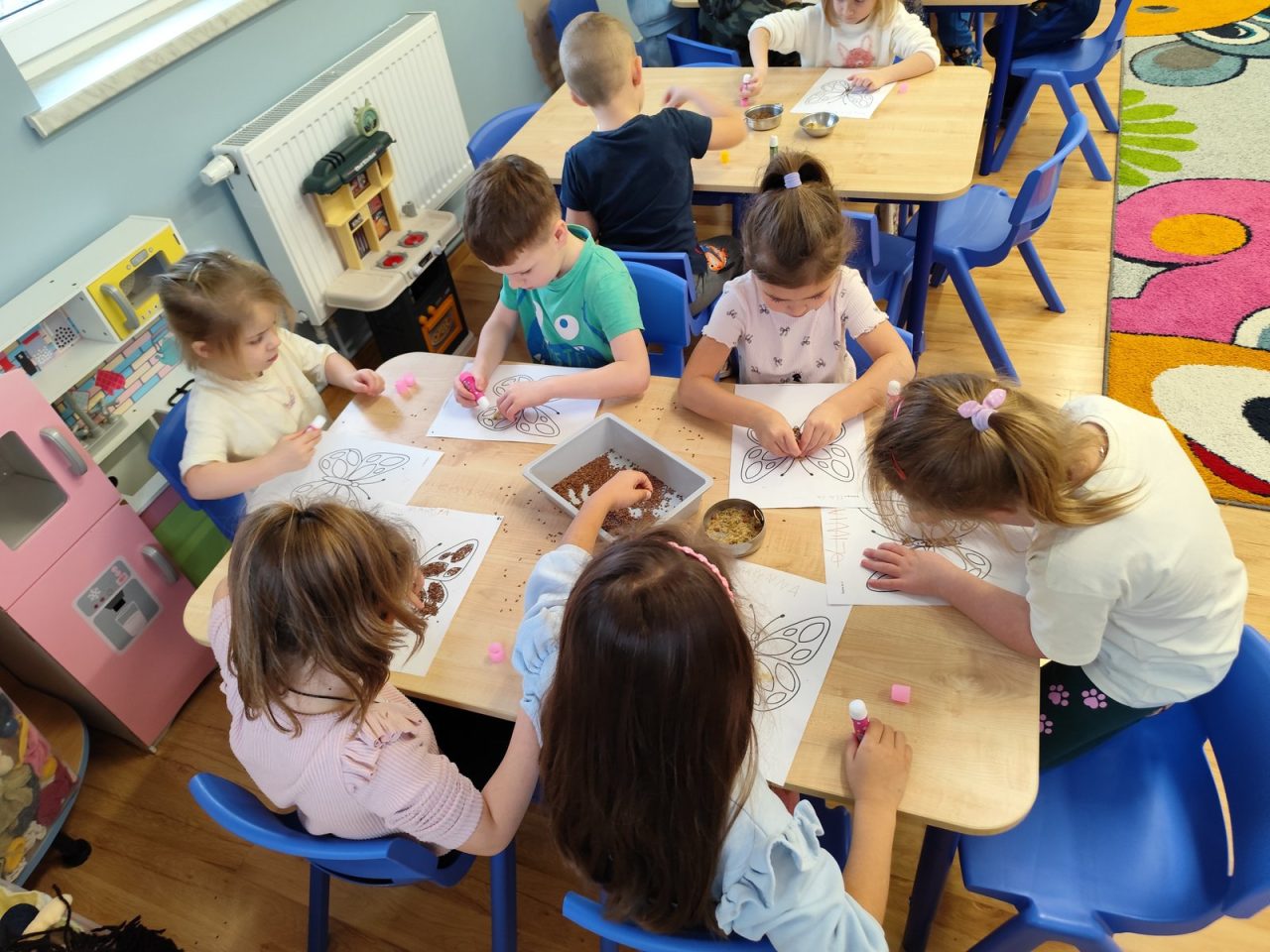 Dzieci starannie smarowały wybrane elementy wzoru klejem, a następnie – za pomocą rączek – wysypywały na nie sypkie materiały, tworząc barwne i fakturowe kompozycje. 🎉