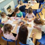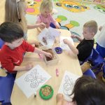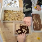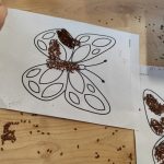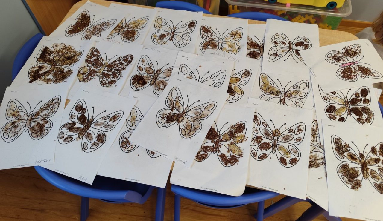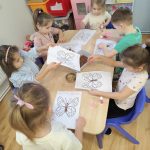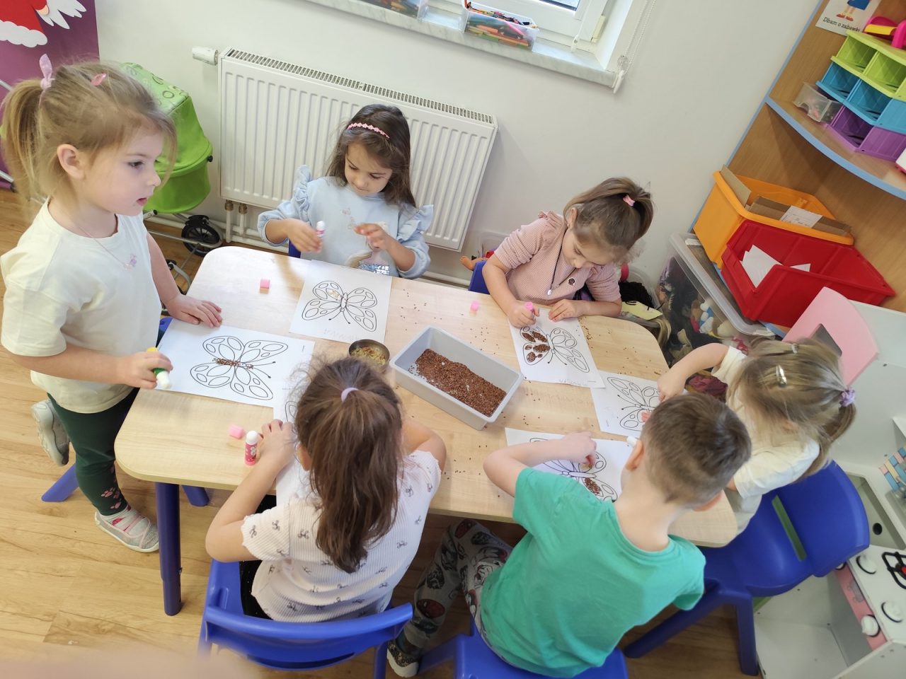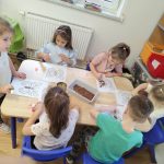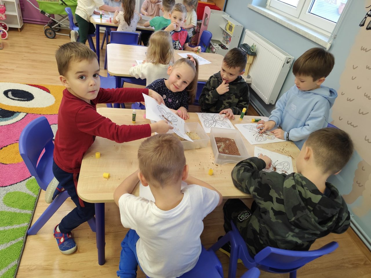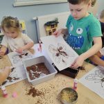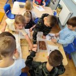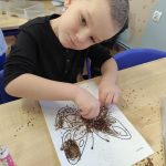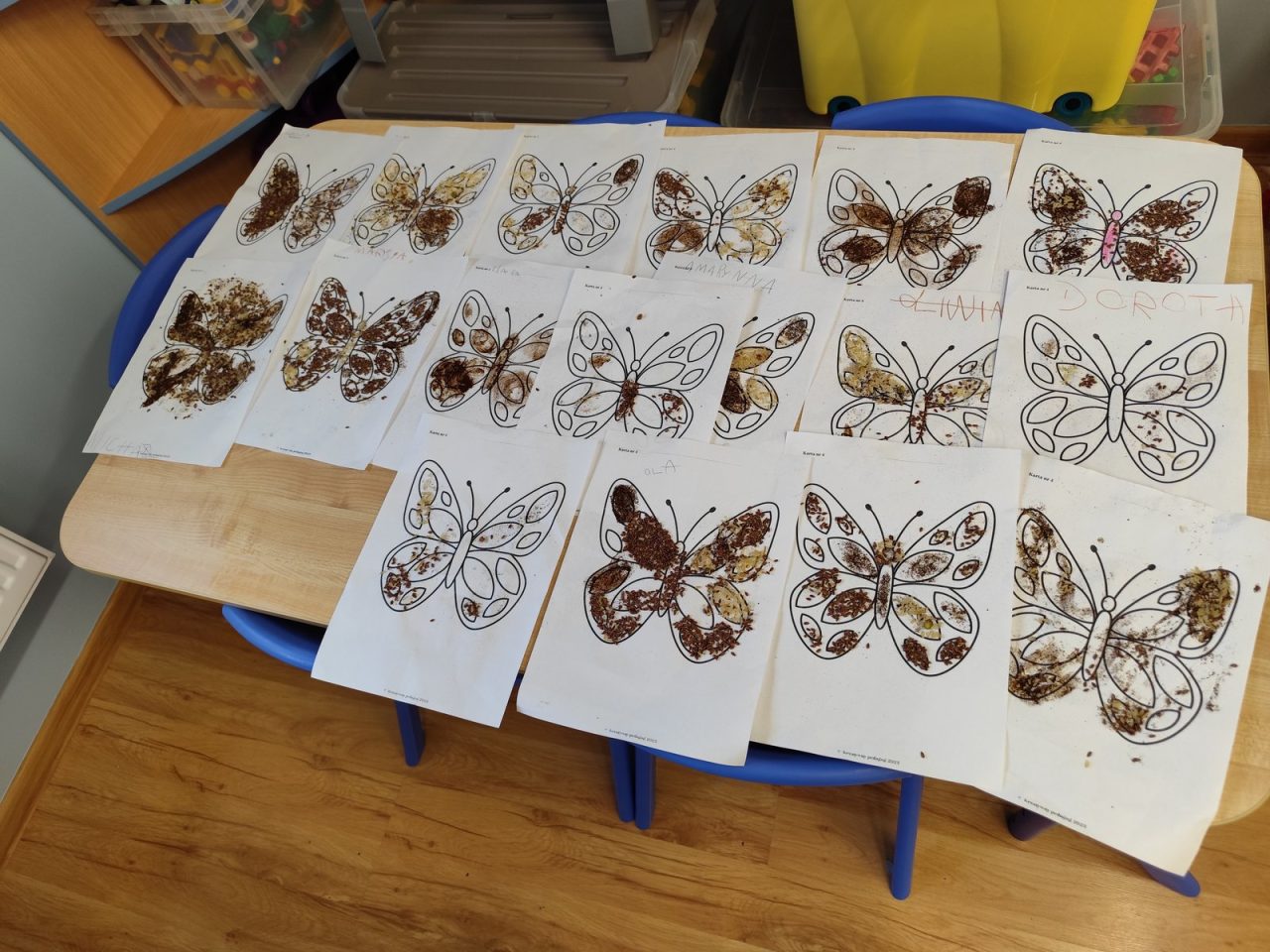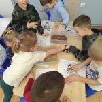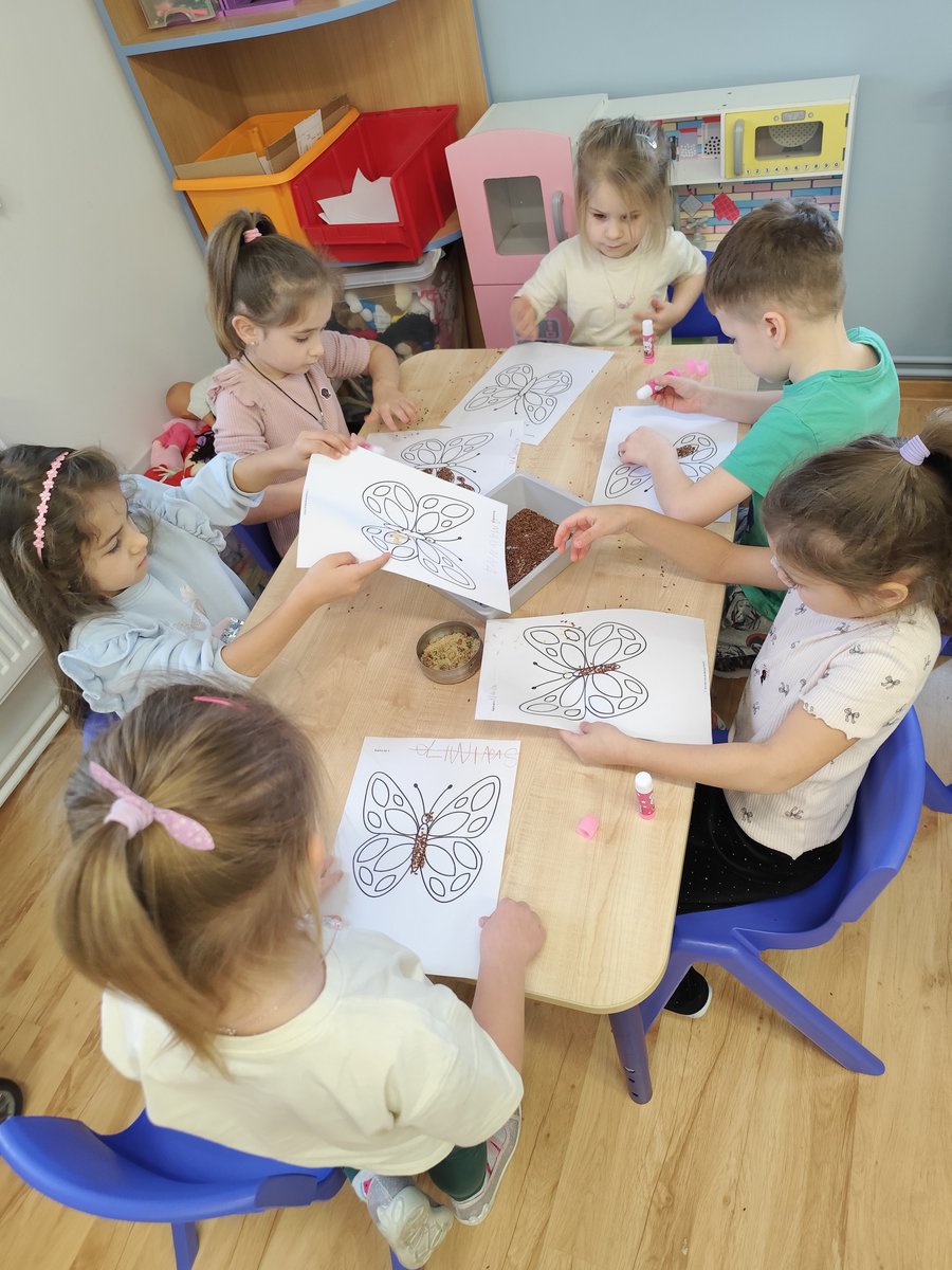 Dzieci starannie smarowały wybrane elementy wzoru klejem, a następnie – za pomocą rączek – wysypywały na nie sypkie materiały, tworząc barwne i fakturowe kompozycje. 🎉