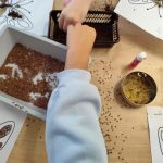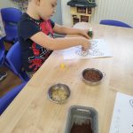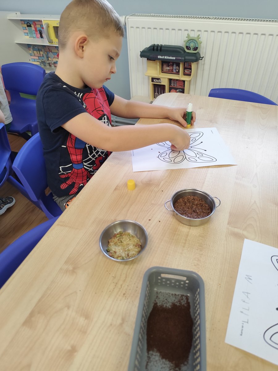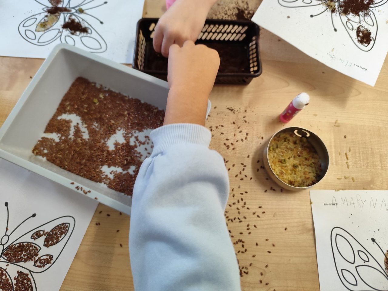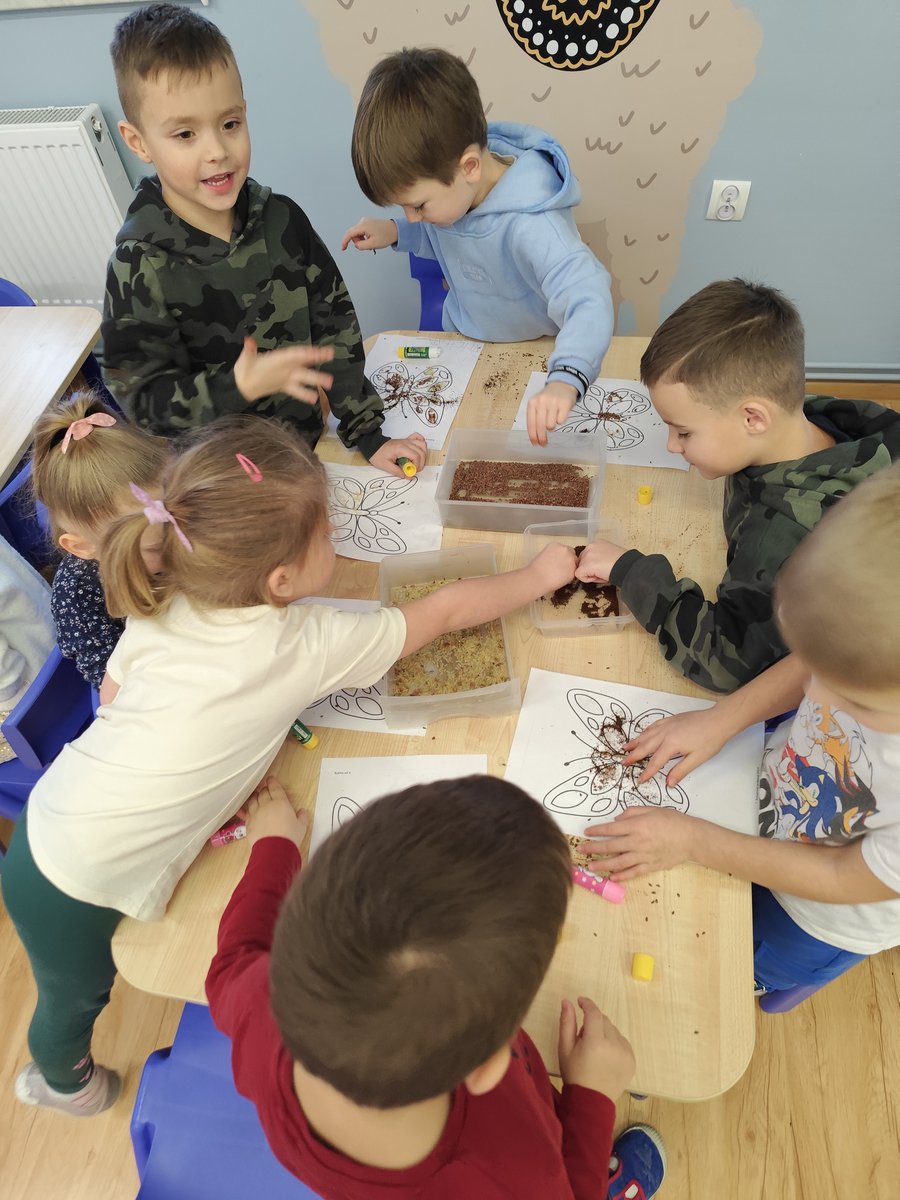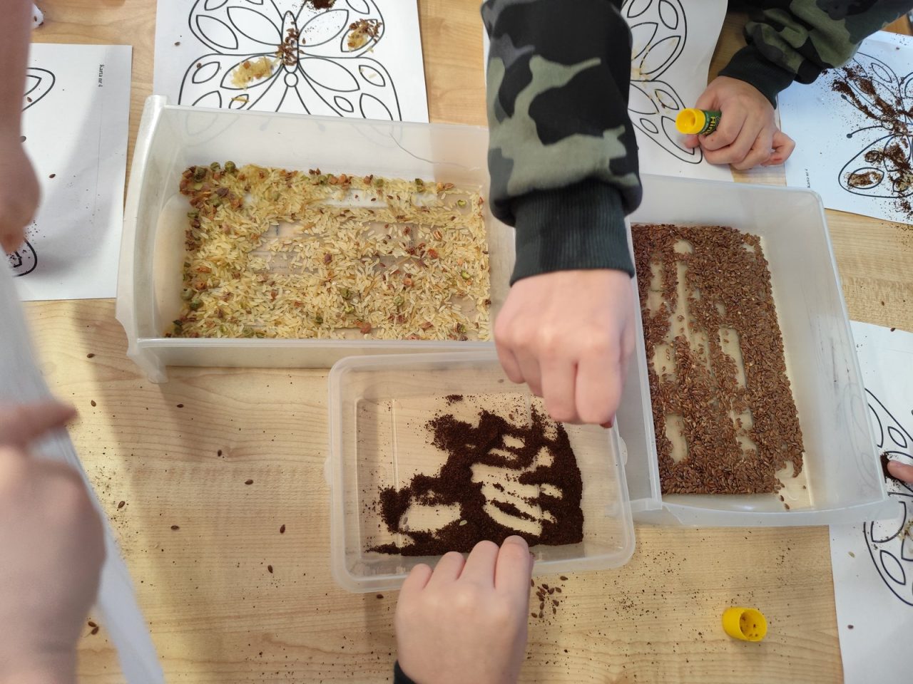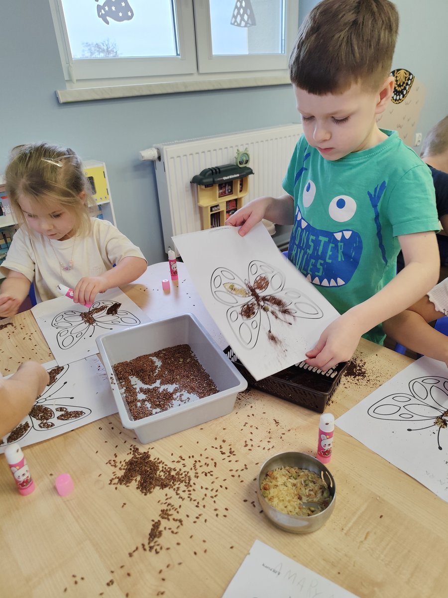 Na początku zajęć dzieci pracowały z przygotowanymi wcześniej szablonami oraz różnorodnymi produktami sypkimi (takimi jak kasza, ryż, makaron, kawa czy siemię lniane). 🍚🍝