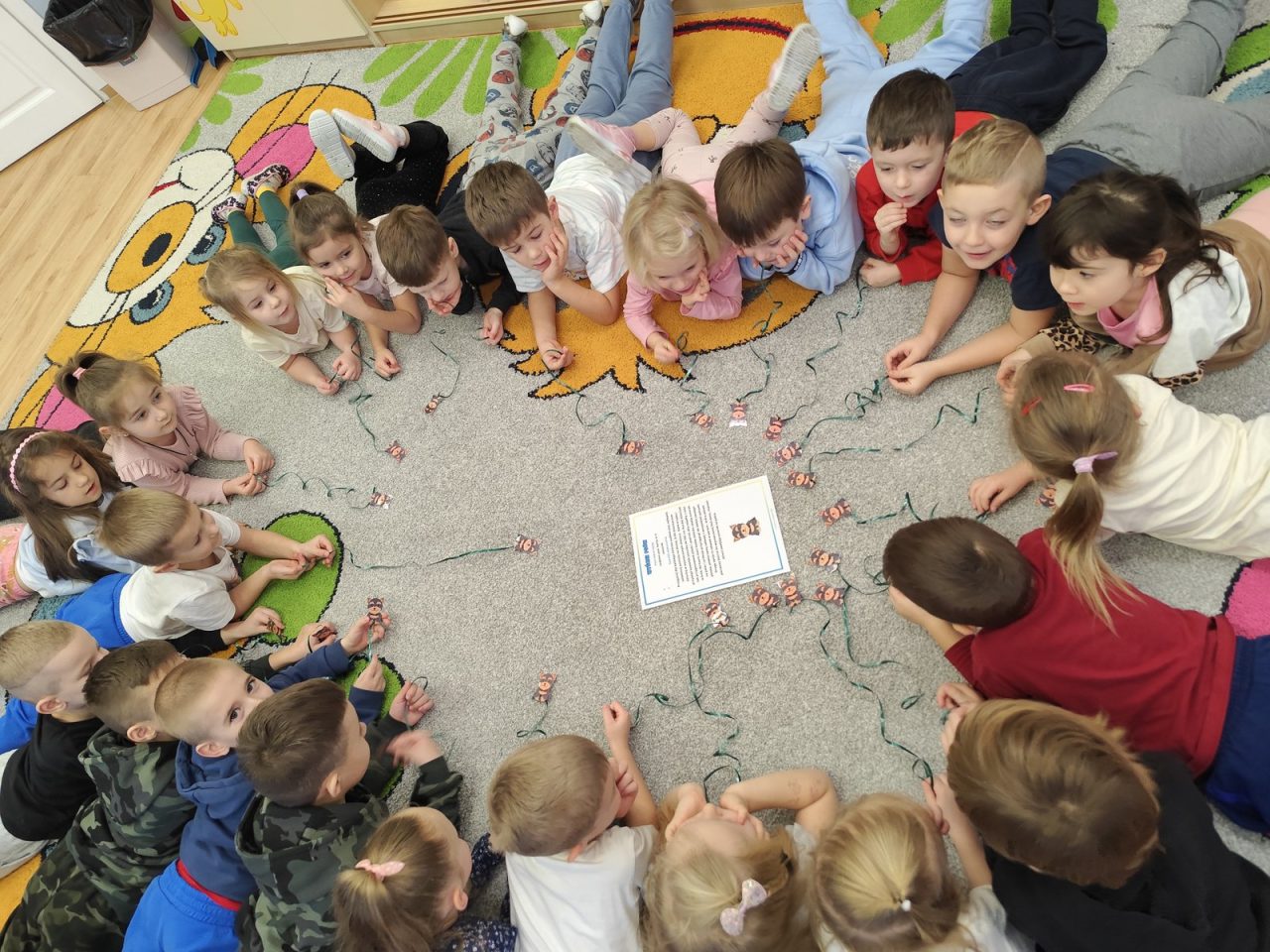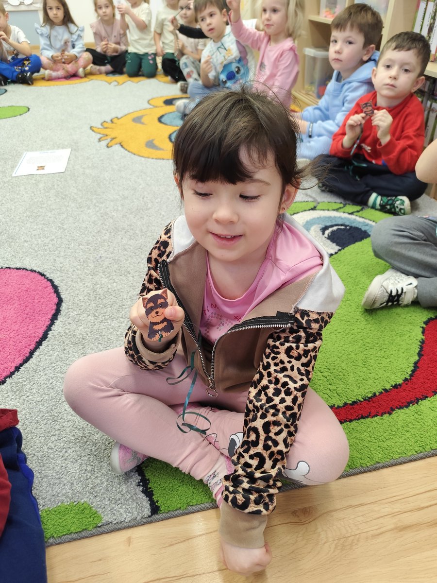 Dzieci siadały w kole i na sygnał starały się jak najszybciej przyciągnąć swojego pieska do siebie, nawijając sznurek na palce. W kolejnej odsłonie zabawy rywalizowały w parach – wygrywał piesek, który pierwszy dotarł do linii mety. 🏆