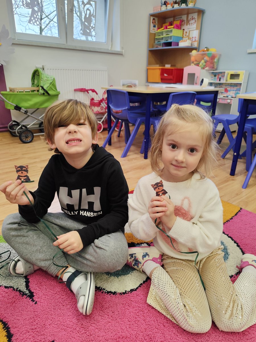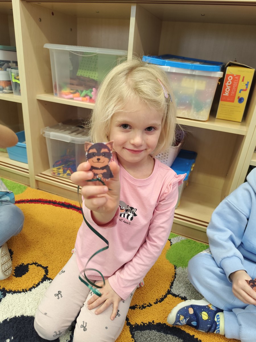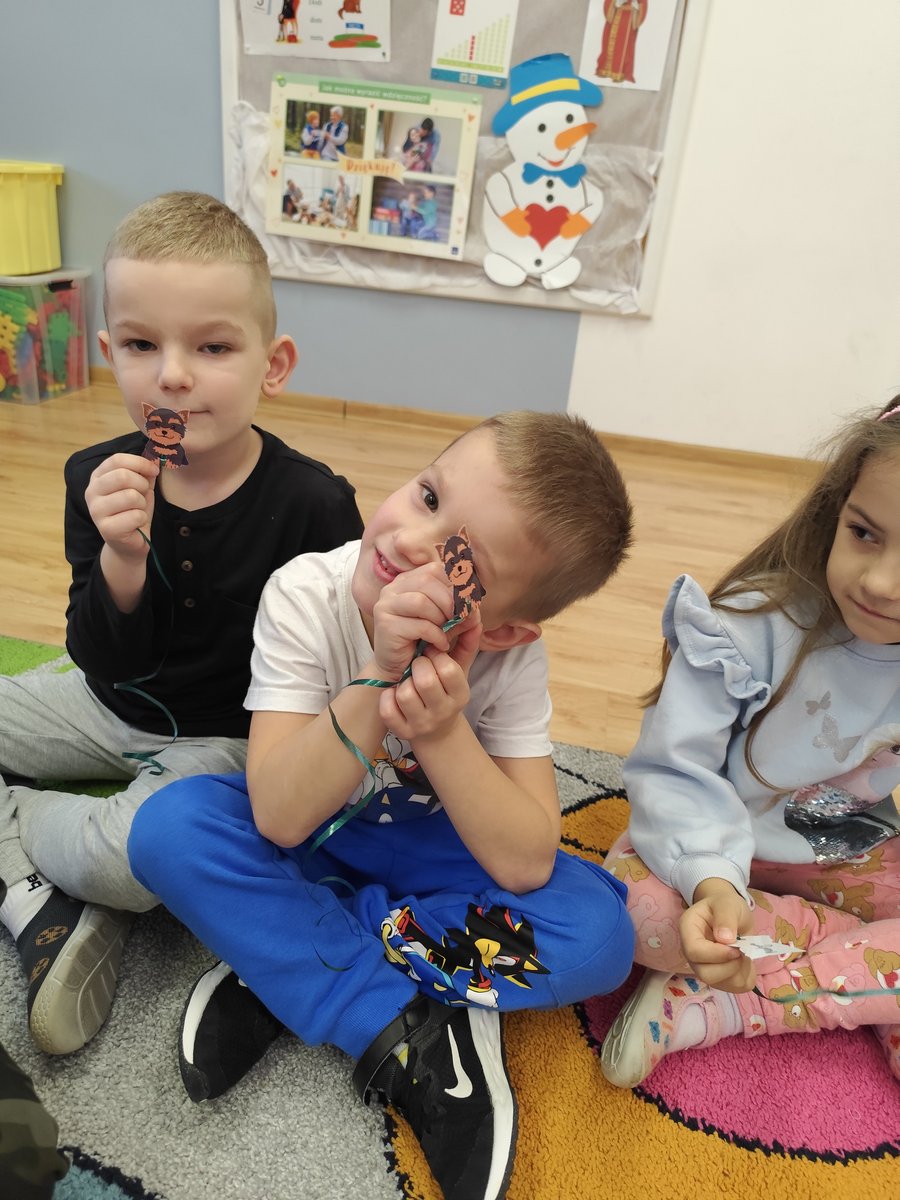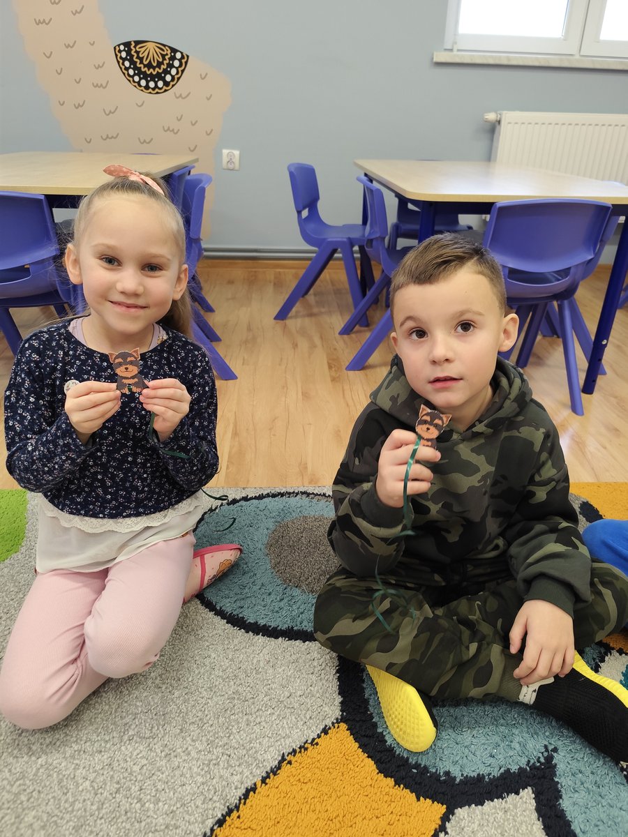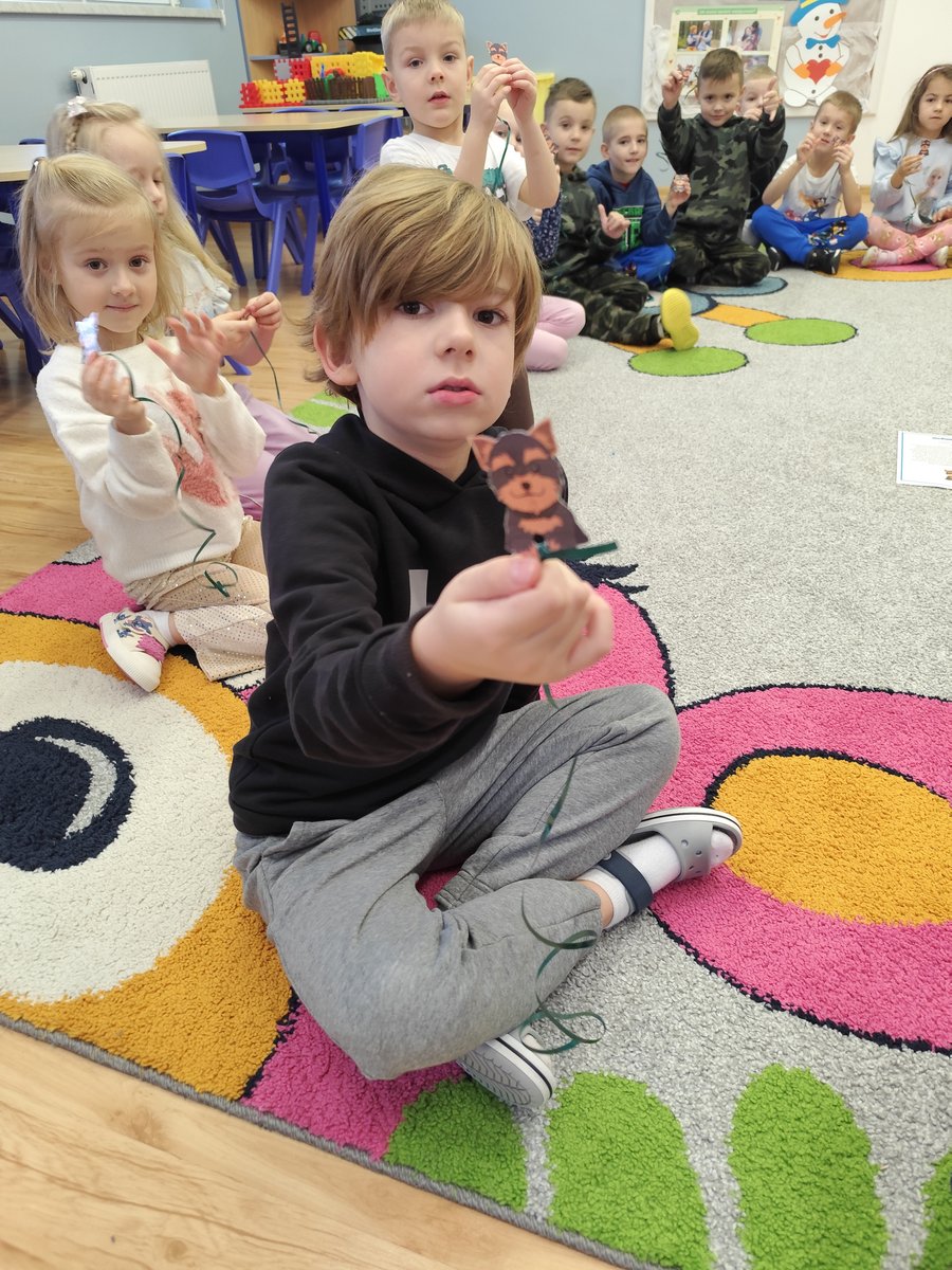 Druga część zajęć miała charakter zabawy ruchowej. Każde dziecko otrzymało własny szablon pieska z przymocowanym sznurkiem. 🐕