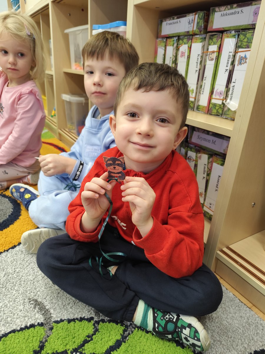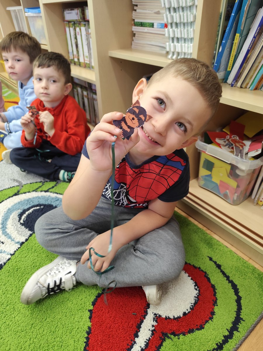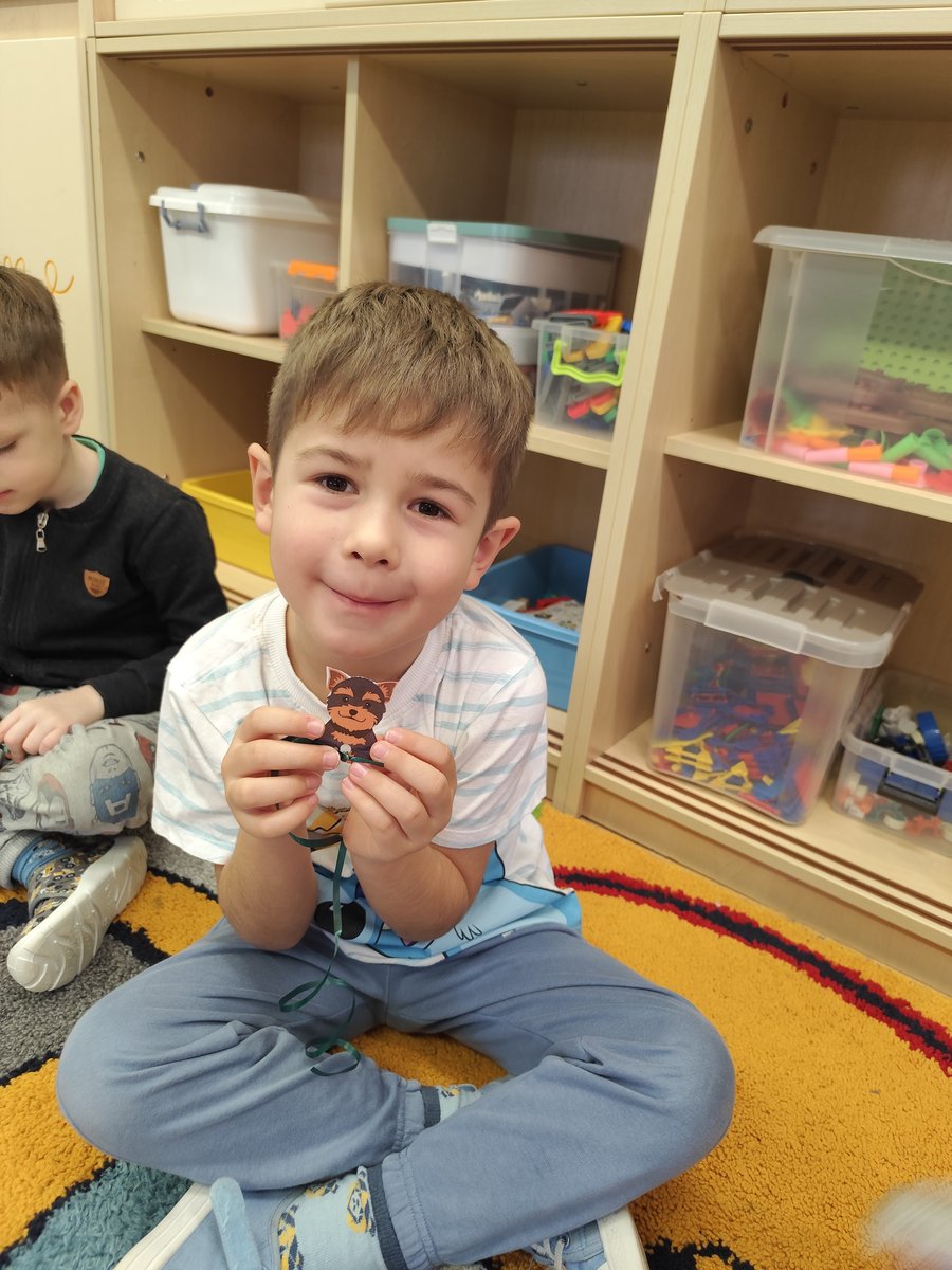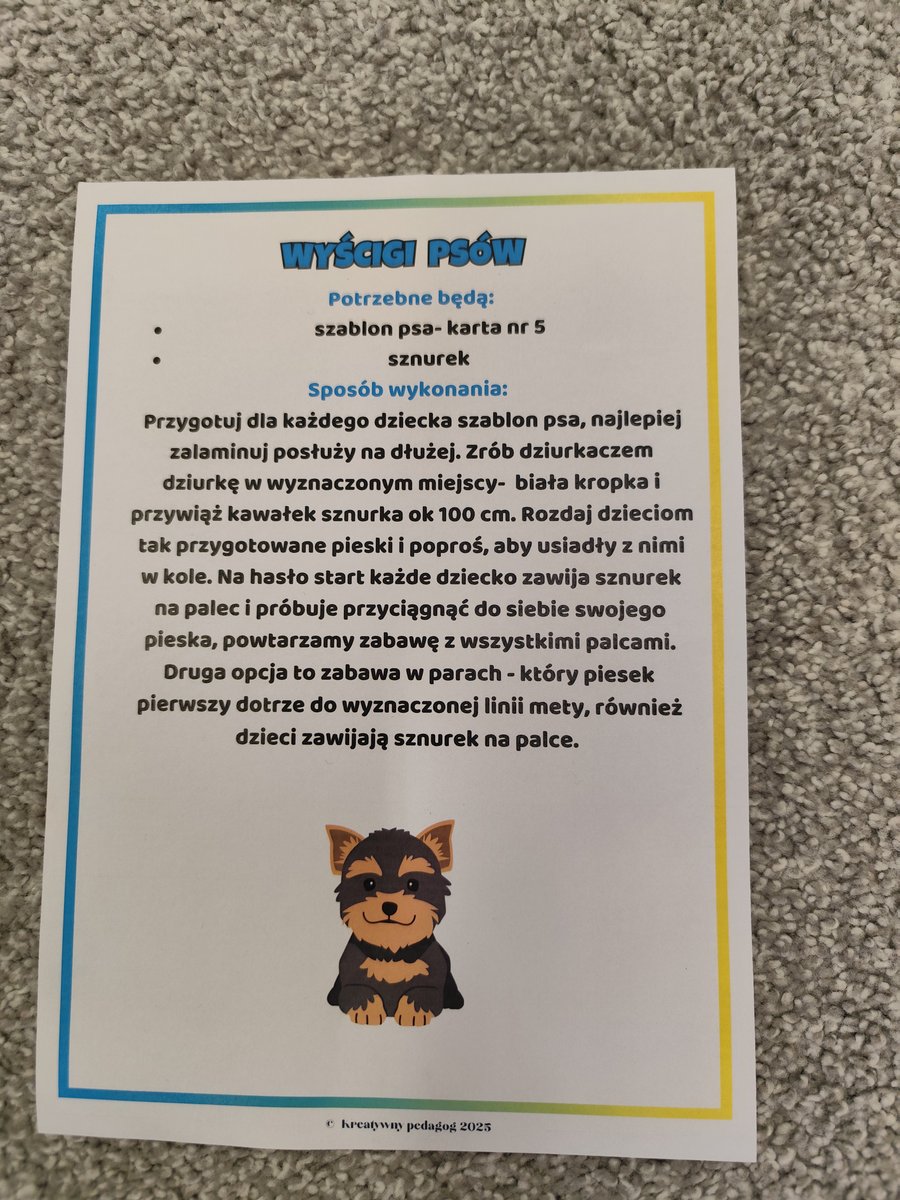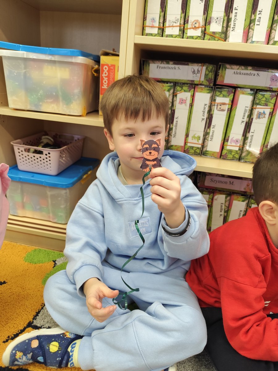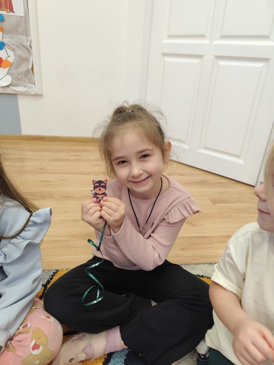 Druga część zajęć miała charakter zabawy ruchowej. Każde dziecko otrzymało własny szablon pieska z przymocowanym sznurkiem. 🐕