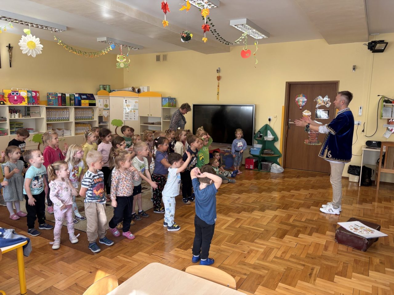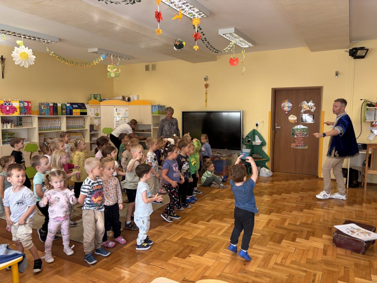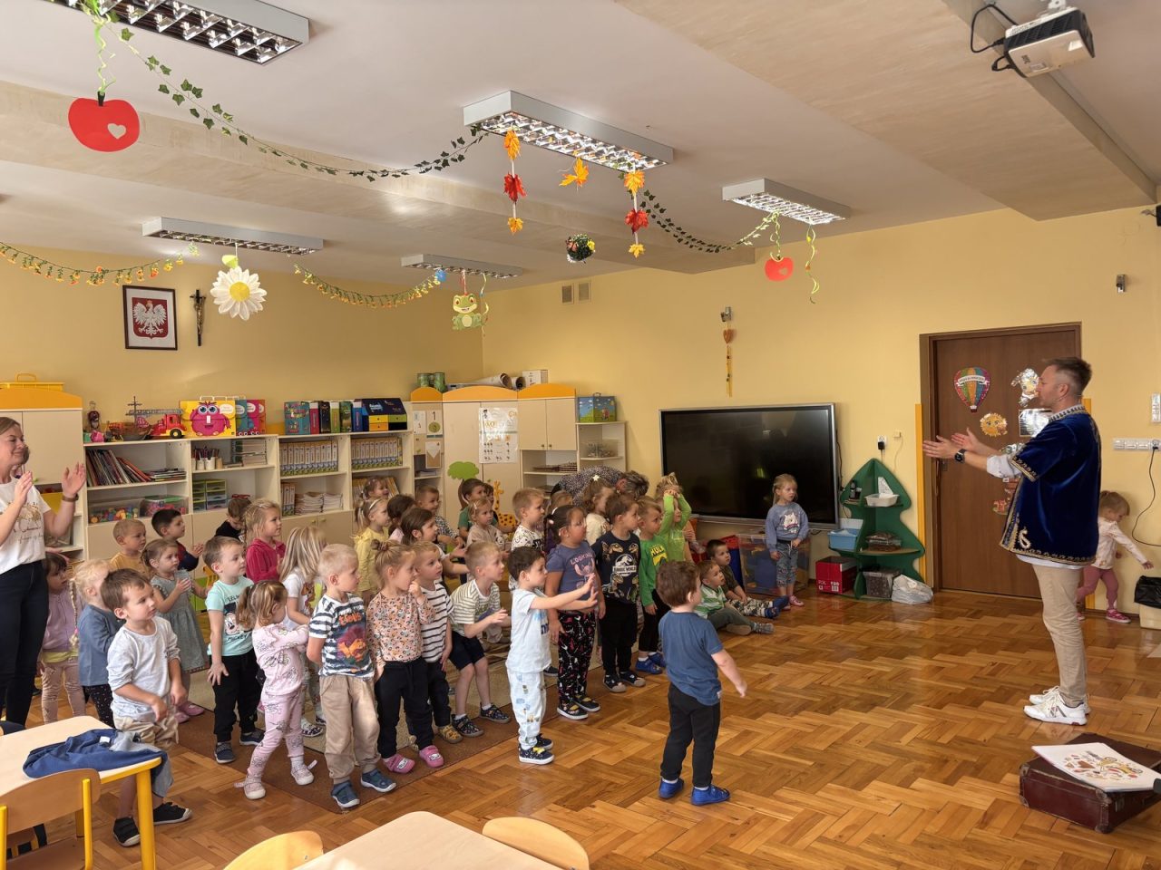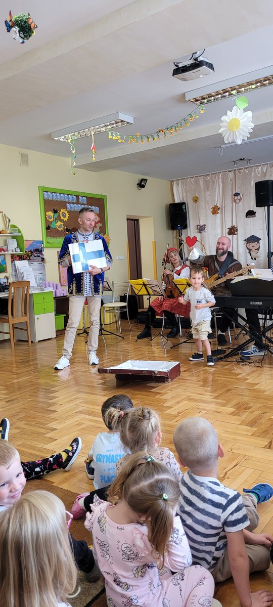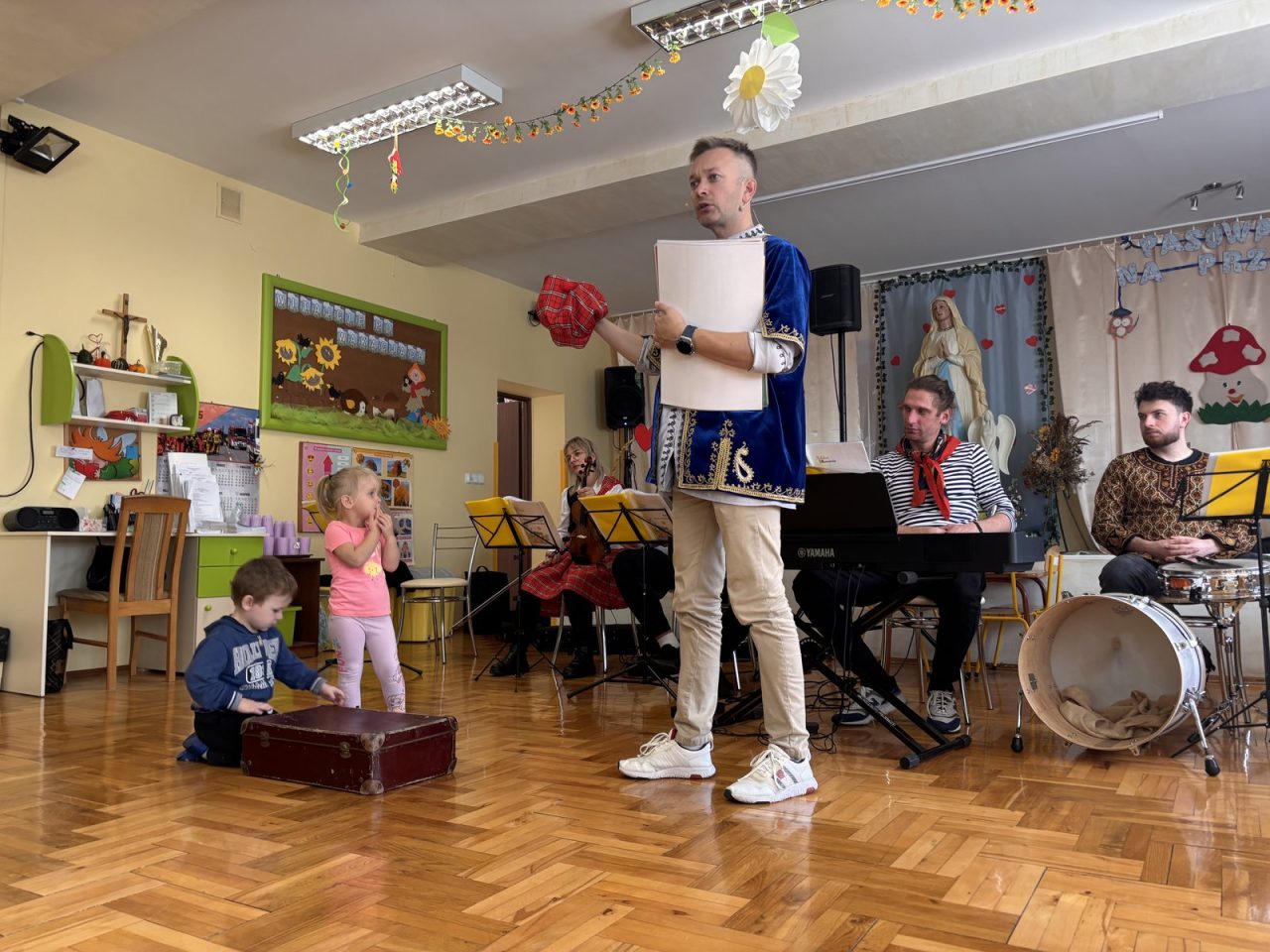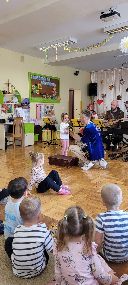 Dnia 09.10.2025 r. gościliśmy w naszym przedszkolu Mobilną filharmonie z pierwszym koncertem z cyklu „Cztery strony świata muzyki”. Wyruszyliśmy w muzyczną podróż po Europie. Od skocznych bałkańskich tańców ,po polskie oberki i czeskie polki, po francuskie walczyki i eleganckie wiedeńskie melodie – właśnie takich melodii mogliśmy dziś posłuchać.
