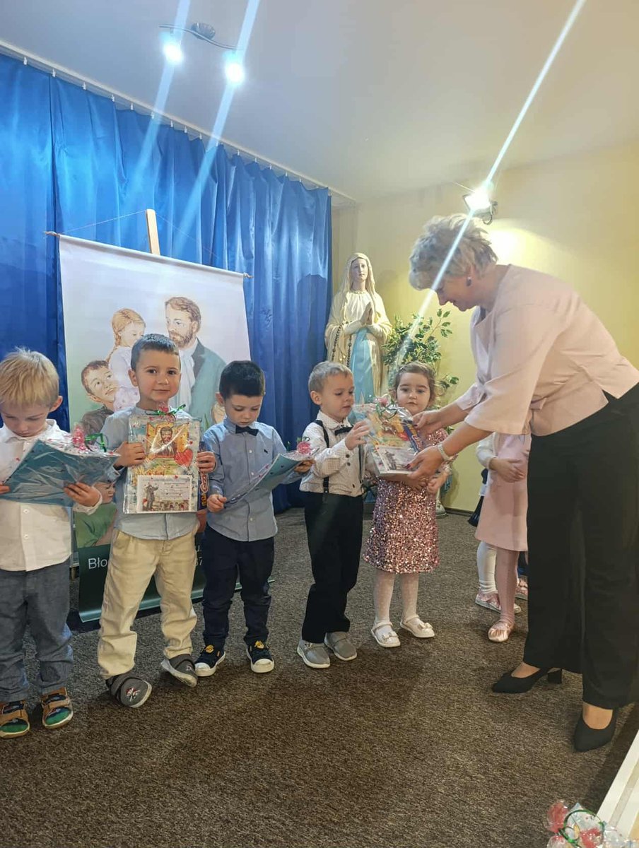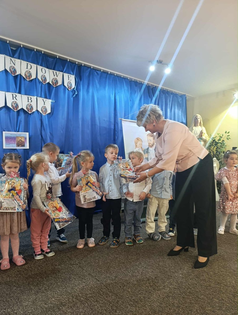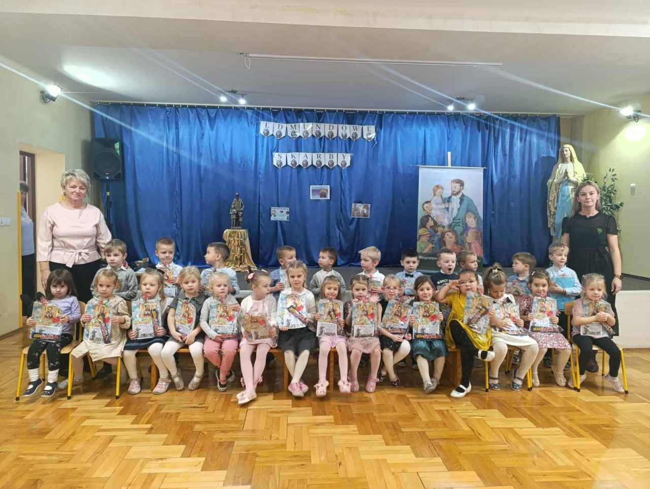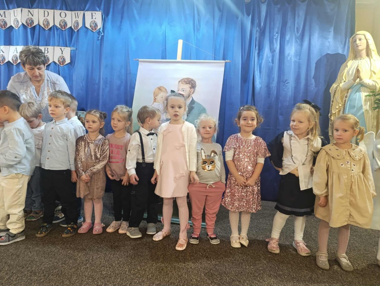 Uroczystość zgromadziła dzieci oraz nauczycieli, a jej celem było podkreślenie wspólnoty, radości i codziennej zabawy przedszkolaków z grupy „Edmundowe Skarby „. Na wstępie Pani Dyrektor powitała wszystkie dzieci oraz powiedziała kilka słów o Bł. Edmundzie Bojanowskim. Następnie obejrzeliśmy krótki film przedstawiający życie oraz działalność Edmunda Bojanowskiego, a dzieci z grupy opowiedziały o Nim kilka słów oraz zaśpiewały piosenkę i hymn grupy. Na koniec „Edmundowe Skarby ” otrzymały upominki oraz słodki poczęstunek jakim były pierniczki 🙂