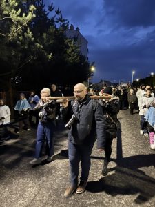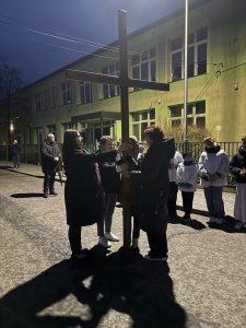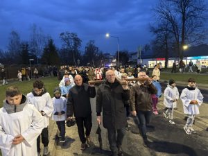 W piątkowy wieczór, przed niedzielą palmową, społeczność naszego miasta, którą tworzą parafianie obu radymniańskich parafii, wyruszyła na Krzyżową Drogę ulicami Radymna. W tym roku nasza parafia organizowała to modlitewne wydarzenie. Rozpoczęliśmy to szczególne nabożeństwo w naszym kościele pw. św. Wawrzyńca a poprowadził je ks. Piotr Czarnecki, który prowadzi misje parafialne w parafii „na górce”. Rozważania stacji Krzyżowej Drogi oraz przebieg całej drogi, przygotowała Akcja Katolicka naszej parafii. Po prawie godzinnej drodze dotarliśmy do kościoła „na górce”. Tam miało miejsce szczególne wydarzenie związane z misjami parafialnymi, a mianowicie postawienie krzyża misyjnego przy kościele. Na zakończenie Drogi Krzyżowej, kapłani obu parafii oraz mężczyźni, podnieśli sporych rozmiarów krzyż, który położony był przy głównym ołtarzu i obchodząc procesyjnie świątynię, modliliśmy się za poszczególne grupy mieszkańców: za mężczyzn i ojców, za kobiety i matki, za młodzież i dzieci. Po dotarciu na wskazane miejsce, krzyż został postawiony i przymocowany a kapłan prowadzący nabożeństwo udzielił wszystkim błogosławieństwa.