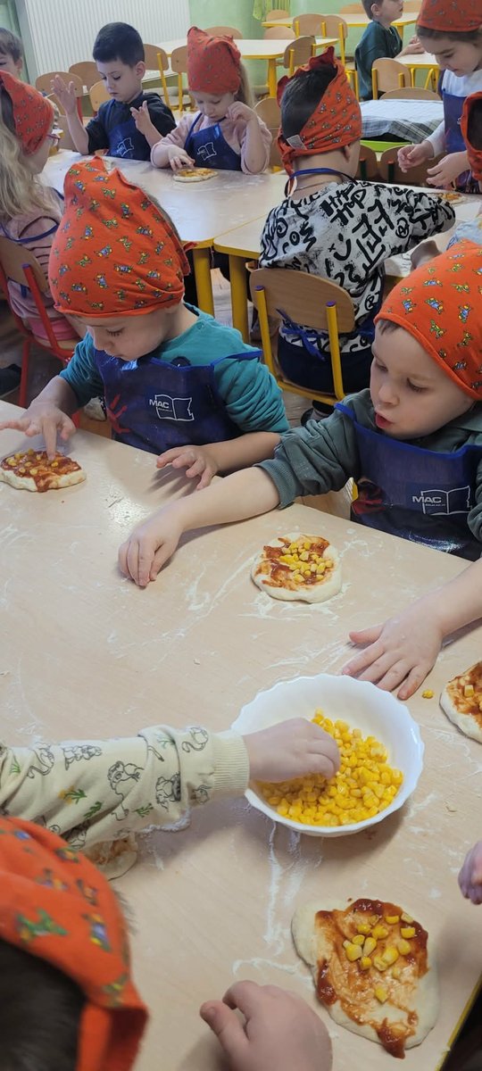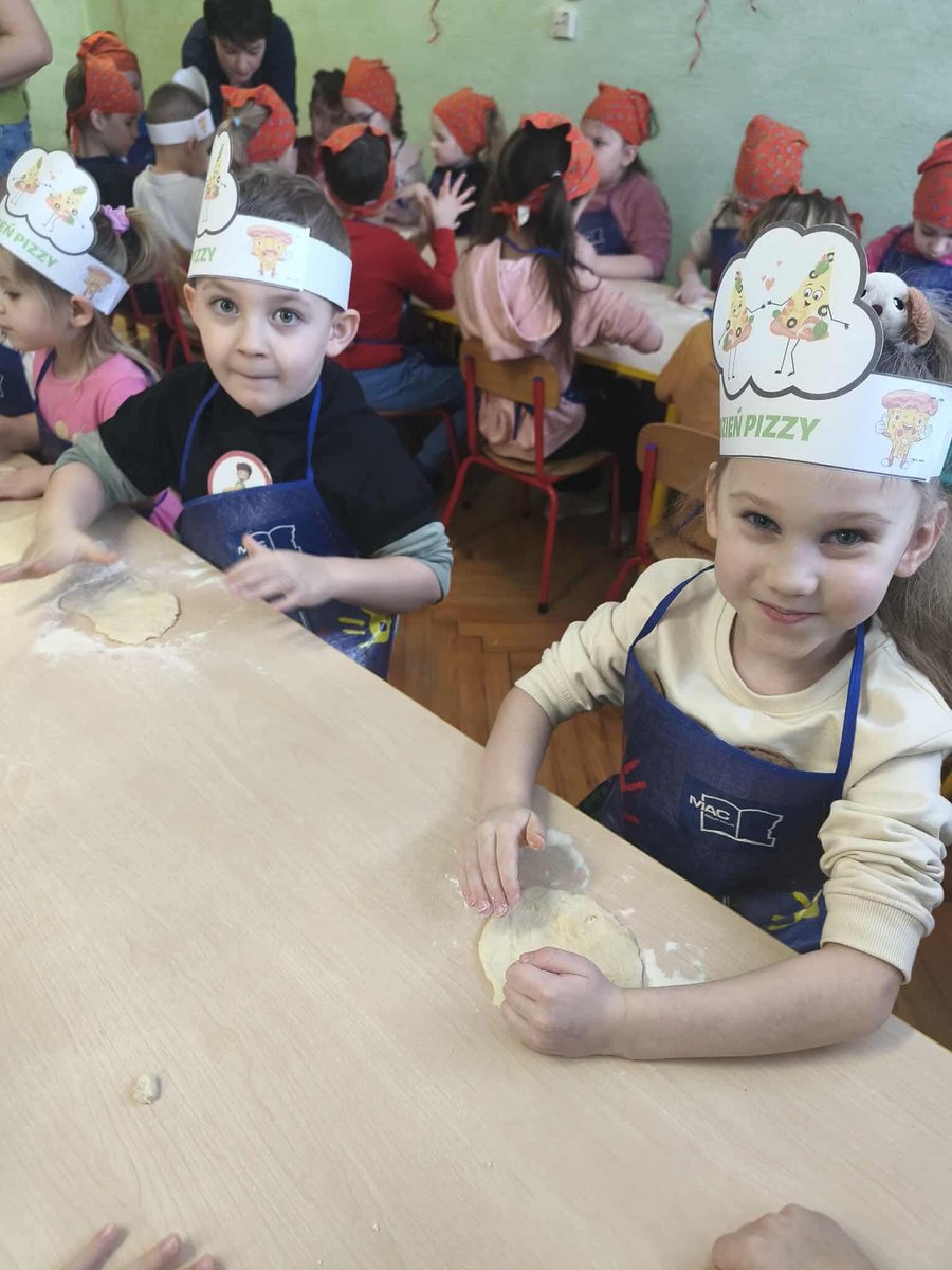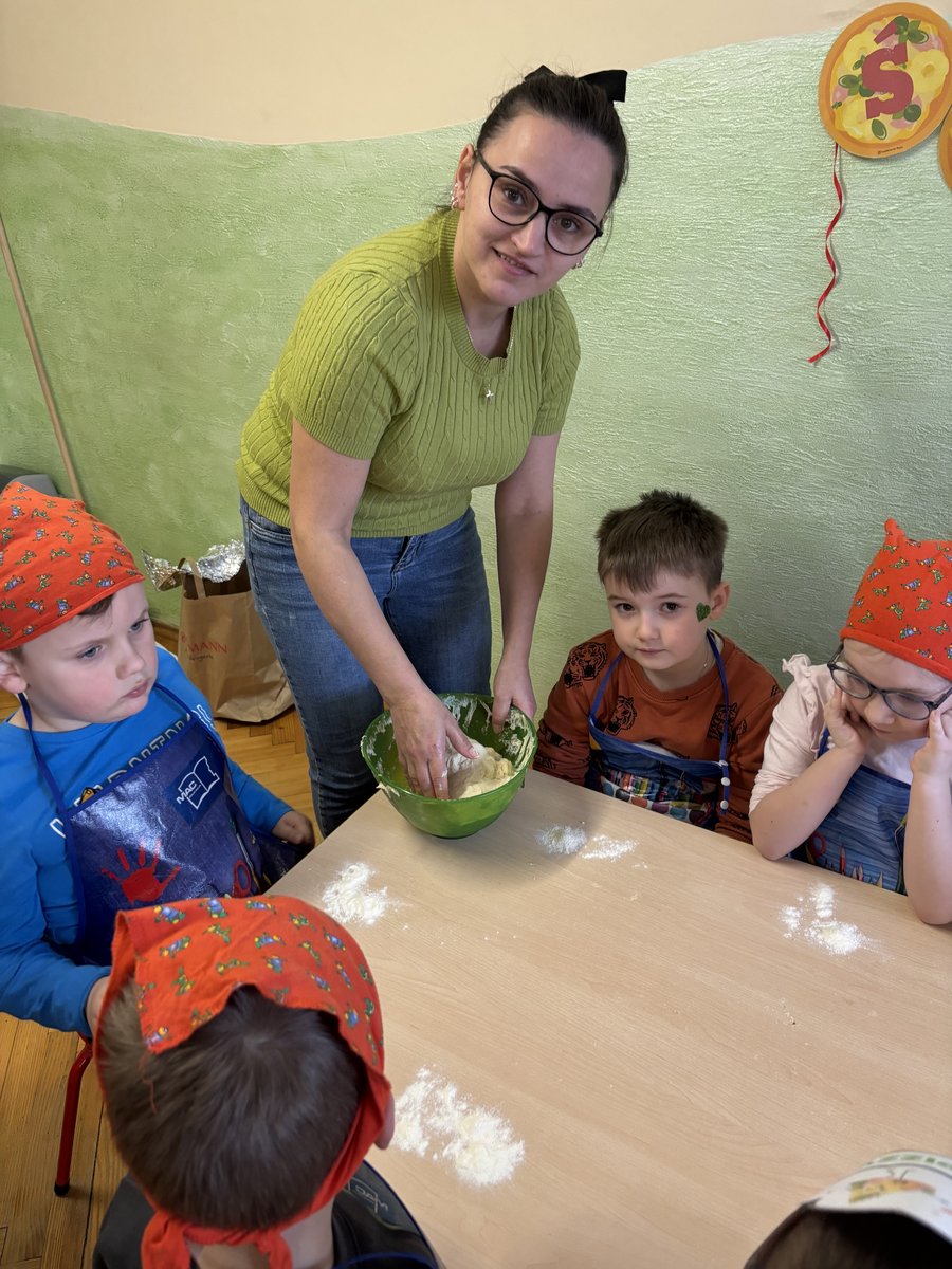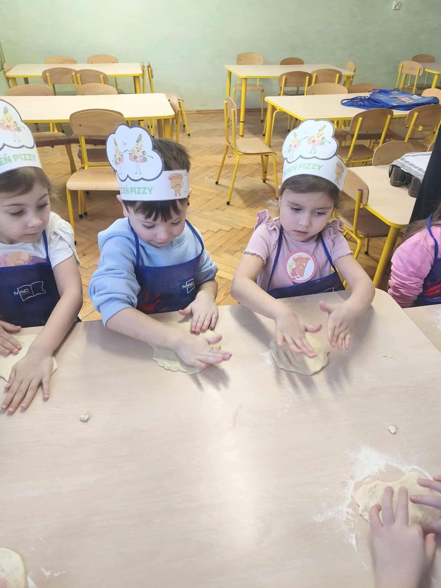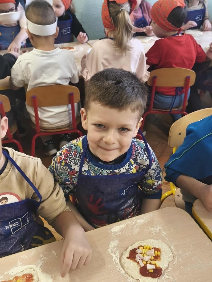 Podczas warsztatów każde z dzieci miało okazję samodzielnie wykonać swoją pizzę, co okazało się wspaniałą zabawą oraz doskonałą okazją do rozwijania kreatywności i umiejętności manualnych. 🍕 Podczas przygotowywania swoich wyjątkowych wypieków, dzieci miały możliwość wyboru ulubionych składników, co sprzyjało ich aktywnemu uczestnictwu i wyrażaniu indywidualnych smaków.