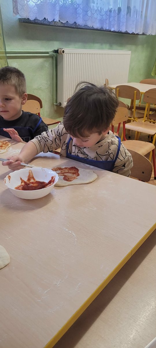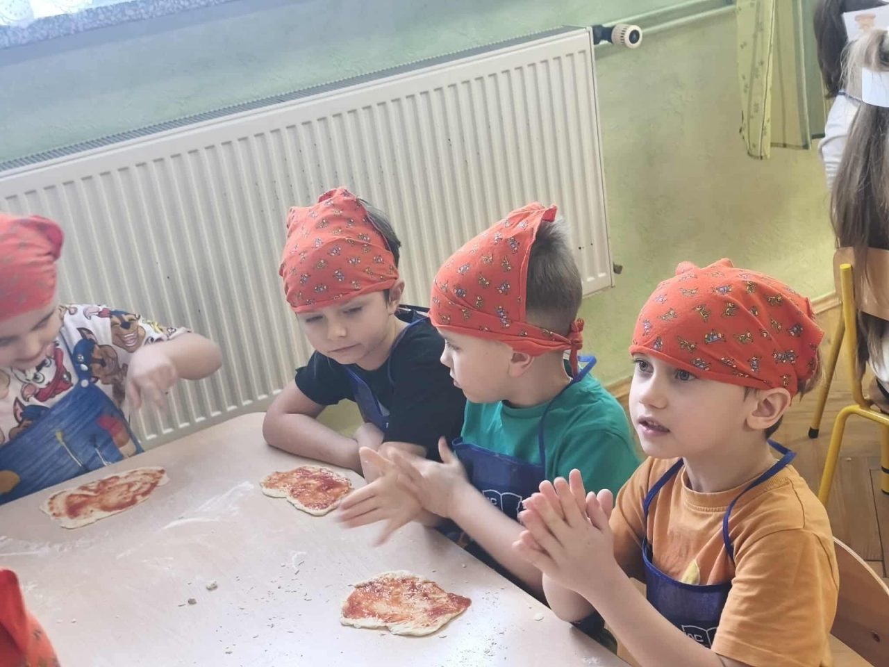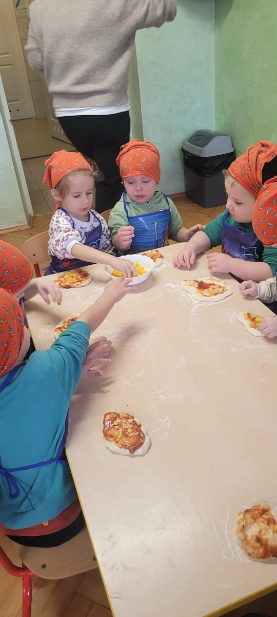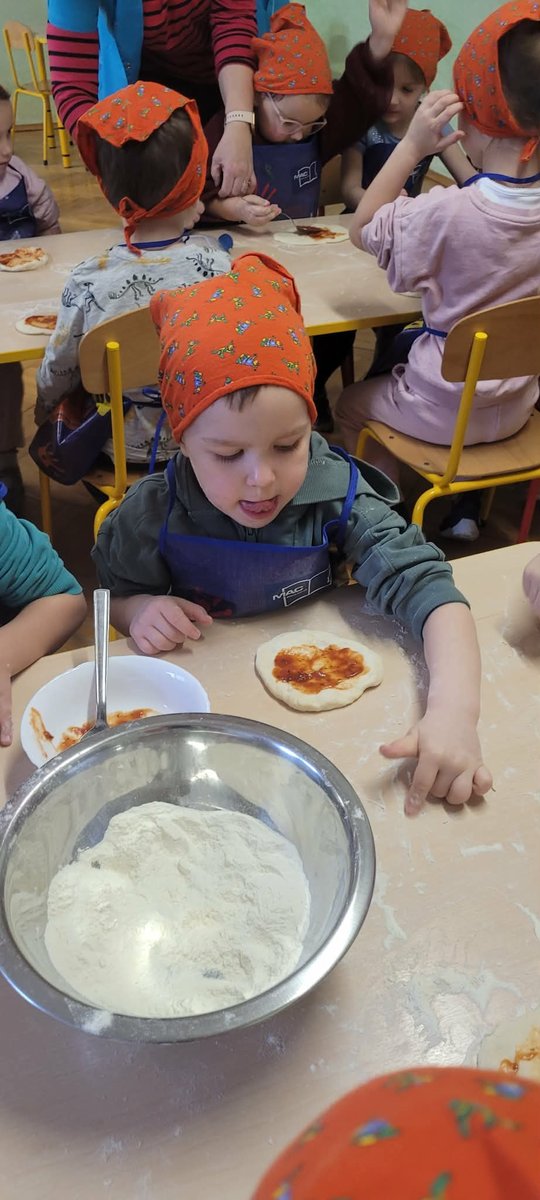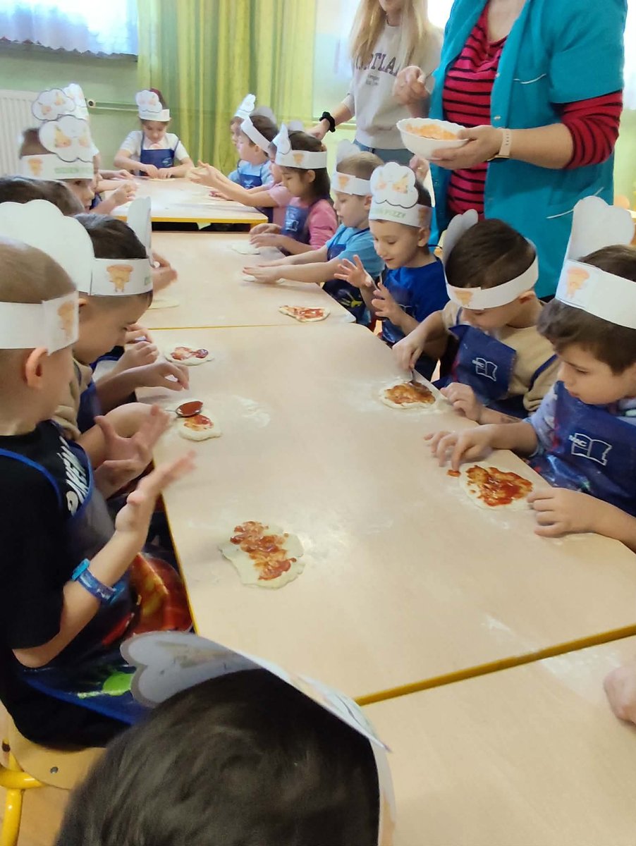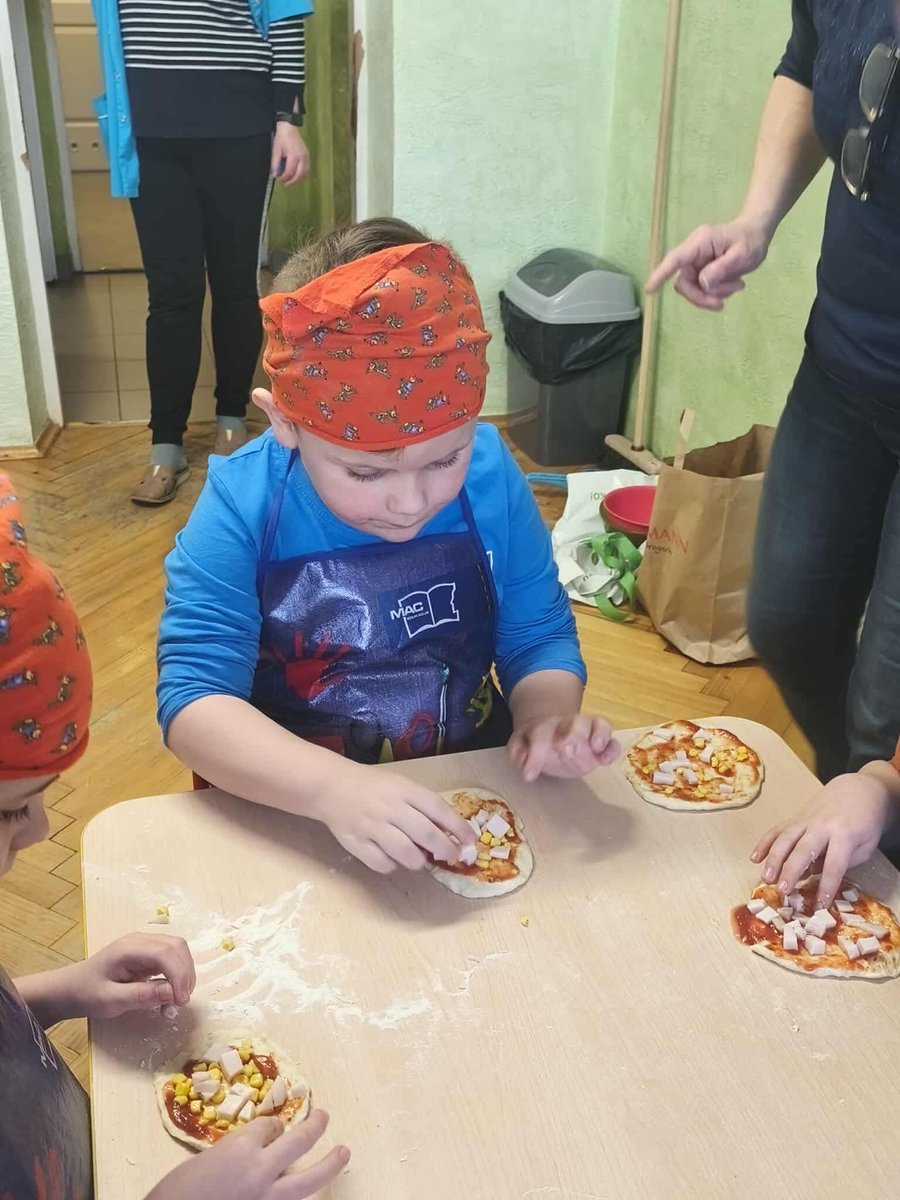 Podczas warsztatów każde z dzieci miało okazję samodzielnie wykonać swoją pizzę, co okazało się wspaniałą zabawą oraz doskonałą okazją do rozwijania kreatywności i umiejętności manualnych. 🍕 Podczas przygotowywania swoich wyjątkowych wypieków, dzieci miały możliwość wyboru ulubionych składników, co sprzyjało ich aktywnemu uczestnictwu i wyrażaniu indywidualnych smaków.