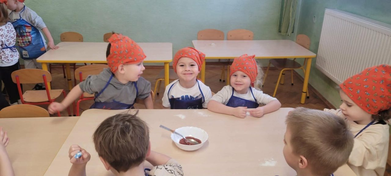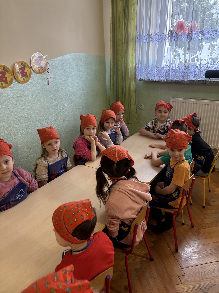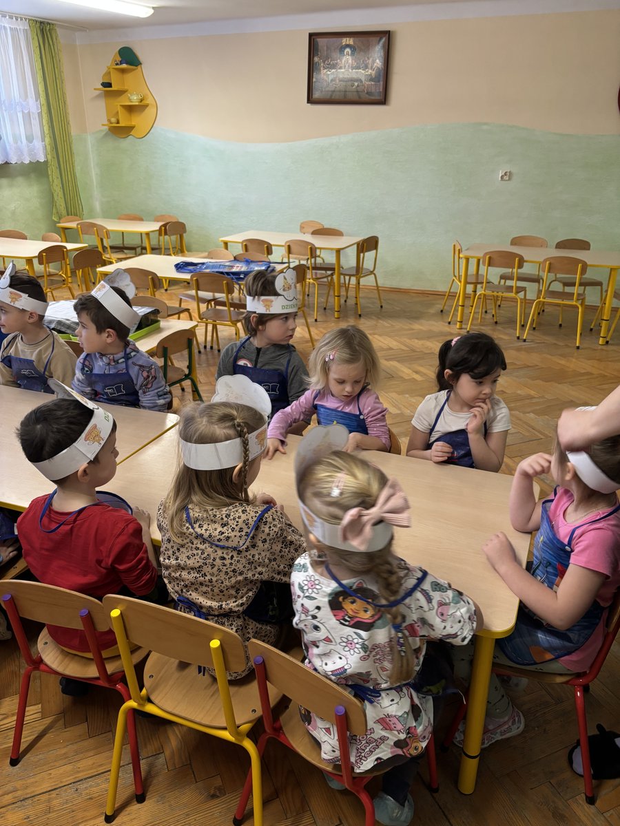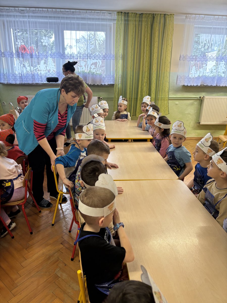 Po pełnych wrażeń aktywnościach, mali kucharze przenieśli się do jadalni, gdzie każdy z uczestników otrzymał specjalne fartuszki i chustki. 👩🍳👨🍳 Celem tego działania było nie tylko wprowadzenie dzieci w smakowity świat kulinariów, ale także nauczenie ich podstawowych zasad higieny i bezpieczeństwa w kuchni.