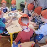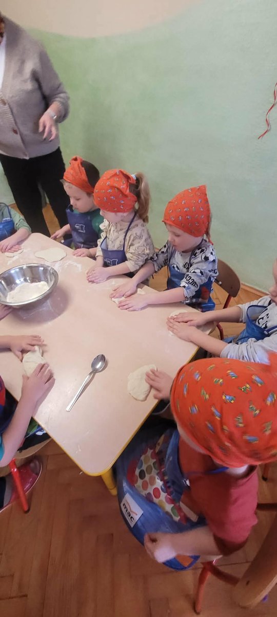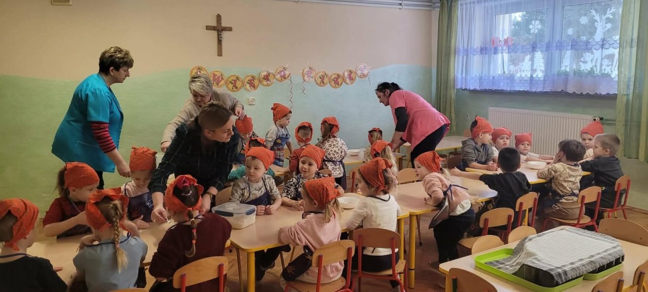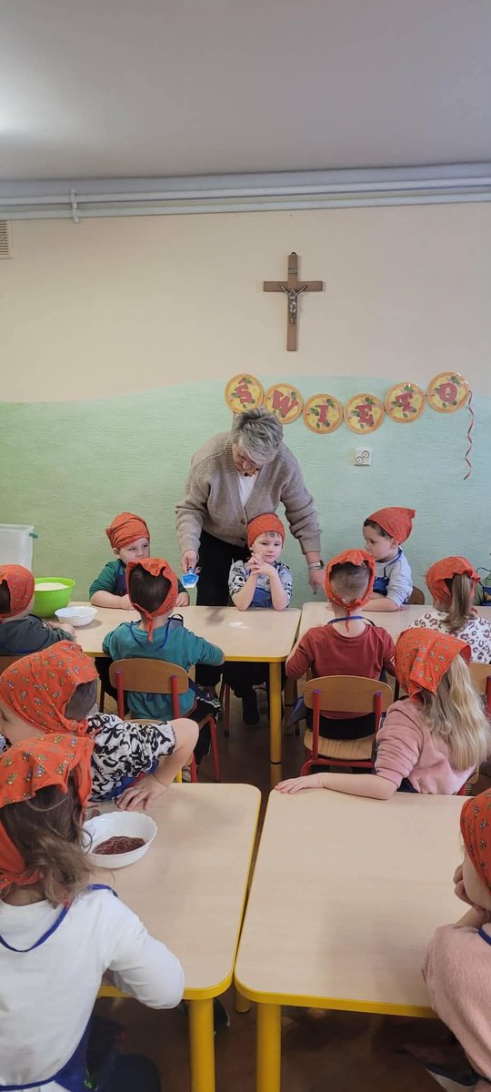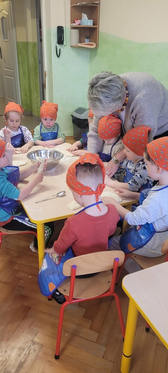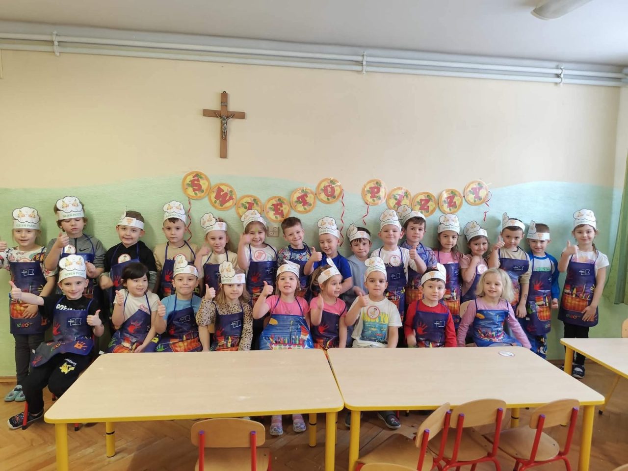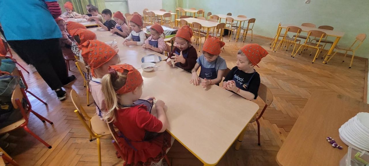 Po pełnych wrażeń aktywnościach, mali kucharze przenieśli się do jadalni, gdzie każdy z uczestników otrzymał specjalne fartuszki i chustki. 👩🍳👨🍳 Celem tego działania było nie tylko wprowadzenie dzieci w smakowity świat kulinariów, ale także nauczenie ich podstawowych zasad higieny i bezpieczeństwa w kuchni.