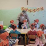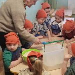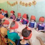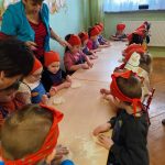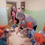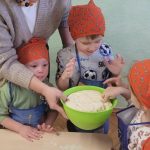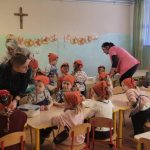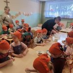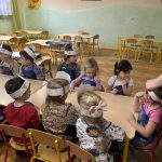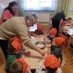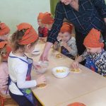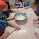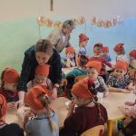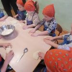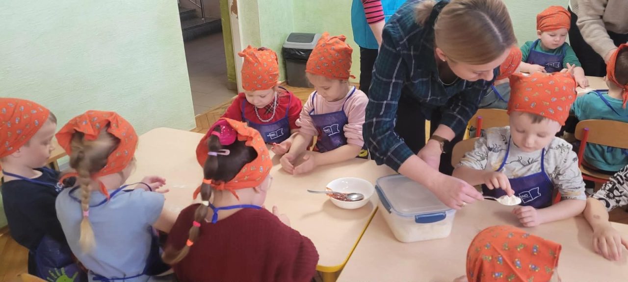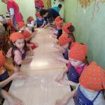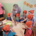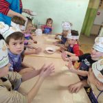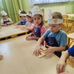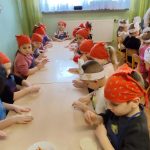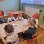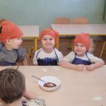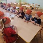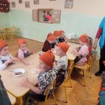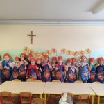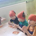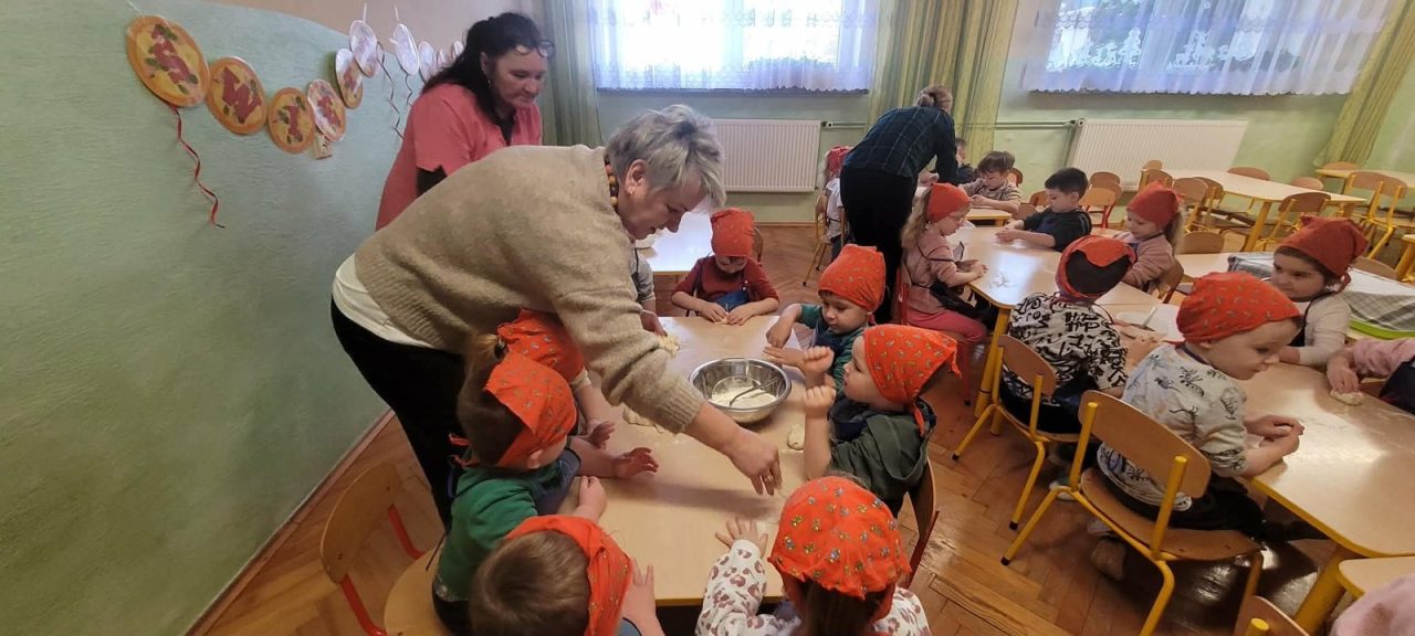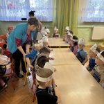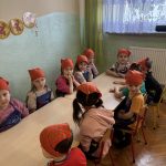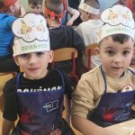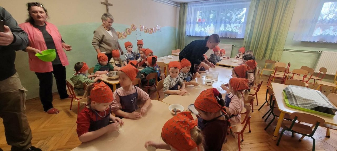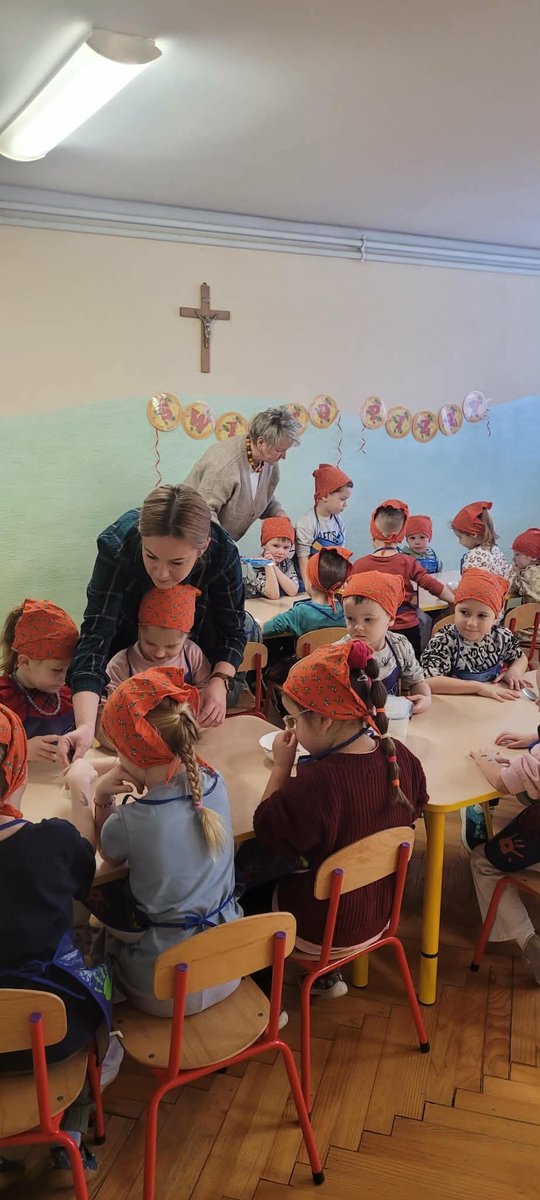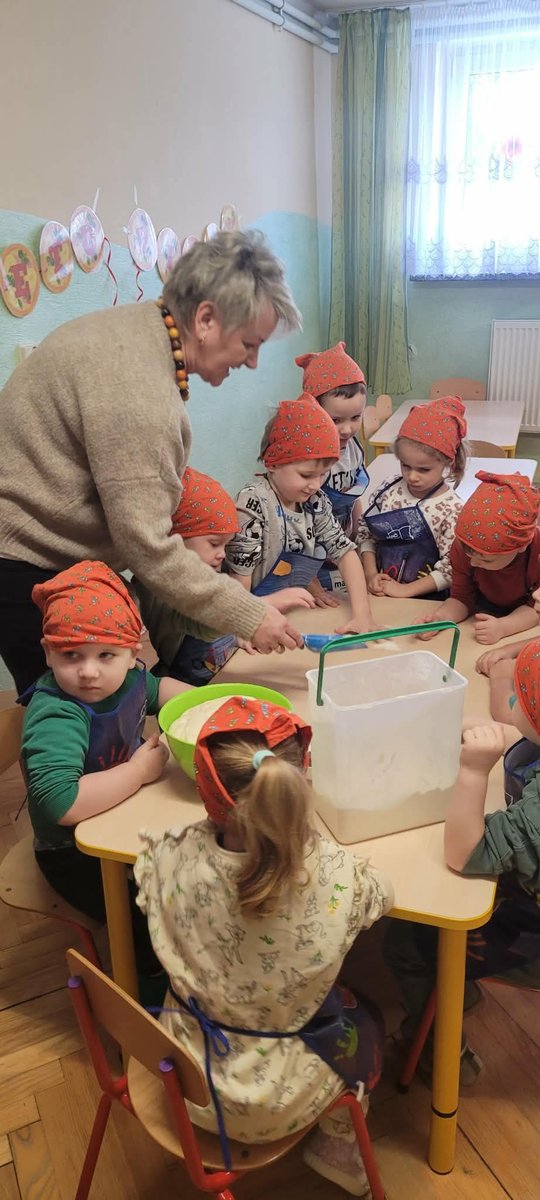 Po pełnych wrażeń aktywnościach, mali kucharze przenieśli się do jadalni, gdzie każdy z uczestników otrzymał specjalne fartuszki i chustki. 👩🍳👨🍳 Celem tego działania było nie tylko wprowadzenie dzieci w smakowity świat kulinariów, ale także nauczenie ich podstawowych zasad higieny i bezpieczeństwa w kuchni.