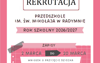 OGŁOSZENIE Dyrektor Przedszkola Parafialnego im. św. Mikołaja w Radymnie informuje,że rekrutacja dzieci do przedszkola na rok szkolny 2026/2027. Odbywa się w okresie od 02.03.2026 r. do 20.03.2026r. Podstawą zapisu dziecka do przedszkola jest WNIOSEK O PRZYJĘCIE DZIECKA na rok szkolny 2026/2027, który należy pobrać w kancelarii przedszkola,na stronie internetowej www.radymno.przemyska.pl. [...]