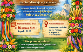 Przedszkole Parafialne im. św. Mikołaja w Radymnie ogłasza konkurs na palmę wielkanocną pt. „Palma jak malowana”. Konkurs ma charakter otwarty. Prace dzieci z naszego przedszkola należy dostarczyć do wychowawczyń grup w terminie do 16.03.2026r (poniedziałek) do godz.1600. Palmy oceniane będą w dwóch kategoriach : indywidualna i grupowa – przyznane zostanie I, [...]